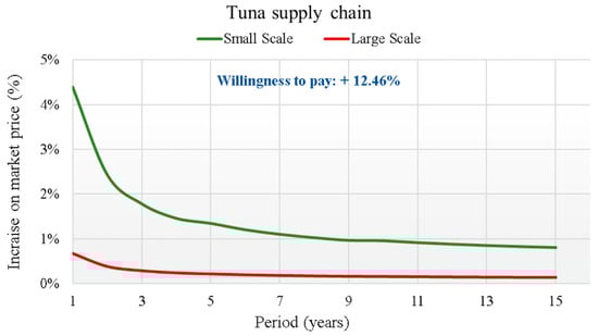 The aim of the economic analysis was to investigate the possible economic sustainability of the application of new traceability technologies for fish products, represented by implementation of the BT for the fish supply chains covered by the questionnaire. This was done to calculate, for each supply chain, economic sustainability by highlighting the break-even point calculated by considering the impact of the new product traceability technologies compared to a traditional traceability system. The economic sustainability judgment was expressed based on the consumer’s WTP a price higher than the average market price to purchase a product that is completely traced and certified from the origin. This “premium price” was obtained, for each supply chain, from the results of the anonymous survey conducted among final consumers, which highlighted the percentage increase in price, compared to the standard of each product, that the consumer himself is WTP to have a product traced in a certain and unequivocal way and certified from the moment of its capture at the sales counter.