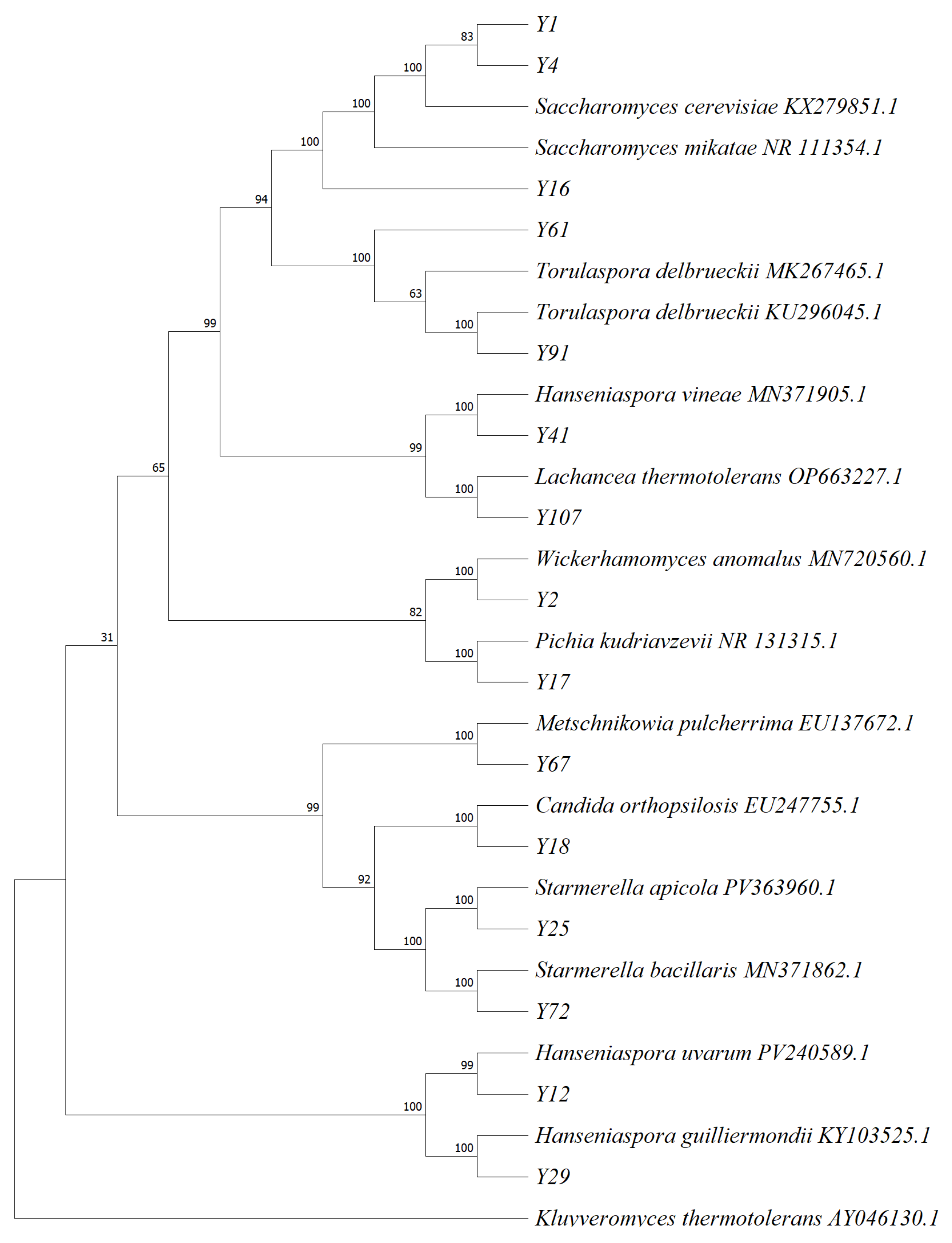 The isolated and purified suspected yeast strains were inoculated into YPD liquid medium and activated at 28 °C for 48 h. The bacteria were collected by centrifugation, and the genomic DNA was extracted by a yeast genomic DNA rapid extraction kit. PCR amplification was performed using ITS1 (5′-TCCGTAGGTGAACCTGCGG-3′ NR_171887.1) and ITS4 (5′-TCCTCCGCTTATTGATATATGC-3′ NR_168827.1) as primers. The reaction system (25 μL) was as follows: ddH