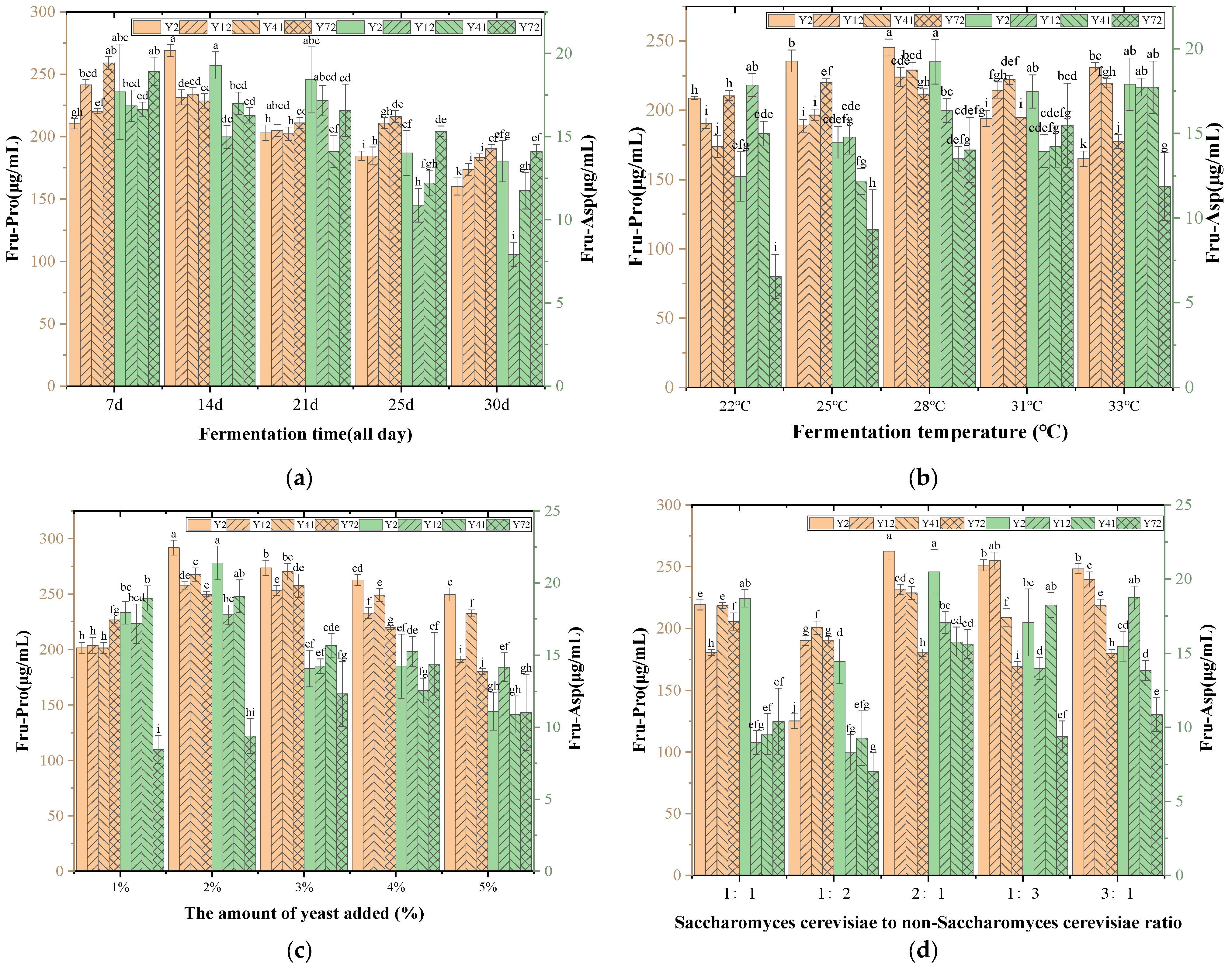 Saccharomyces cerevisiae was the volume of the seed liquid). The five fermentation tanks were placed in an incubator at fermentation temperatures of 22 °C, 25 °C, 28 °C, 31 °C, and 34 °C, respectively, and fermented for 14 days (336 h), repeating the above steps three times. After the fermentation, the content of Amadori compounds in the Msalais was detected in each fermentor to determine the optimal fermentation temperature [