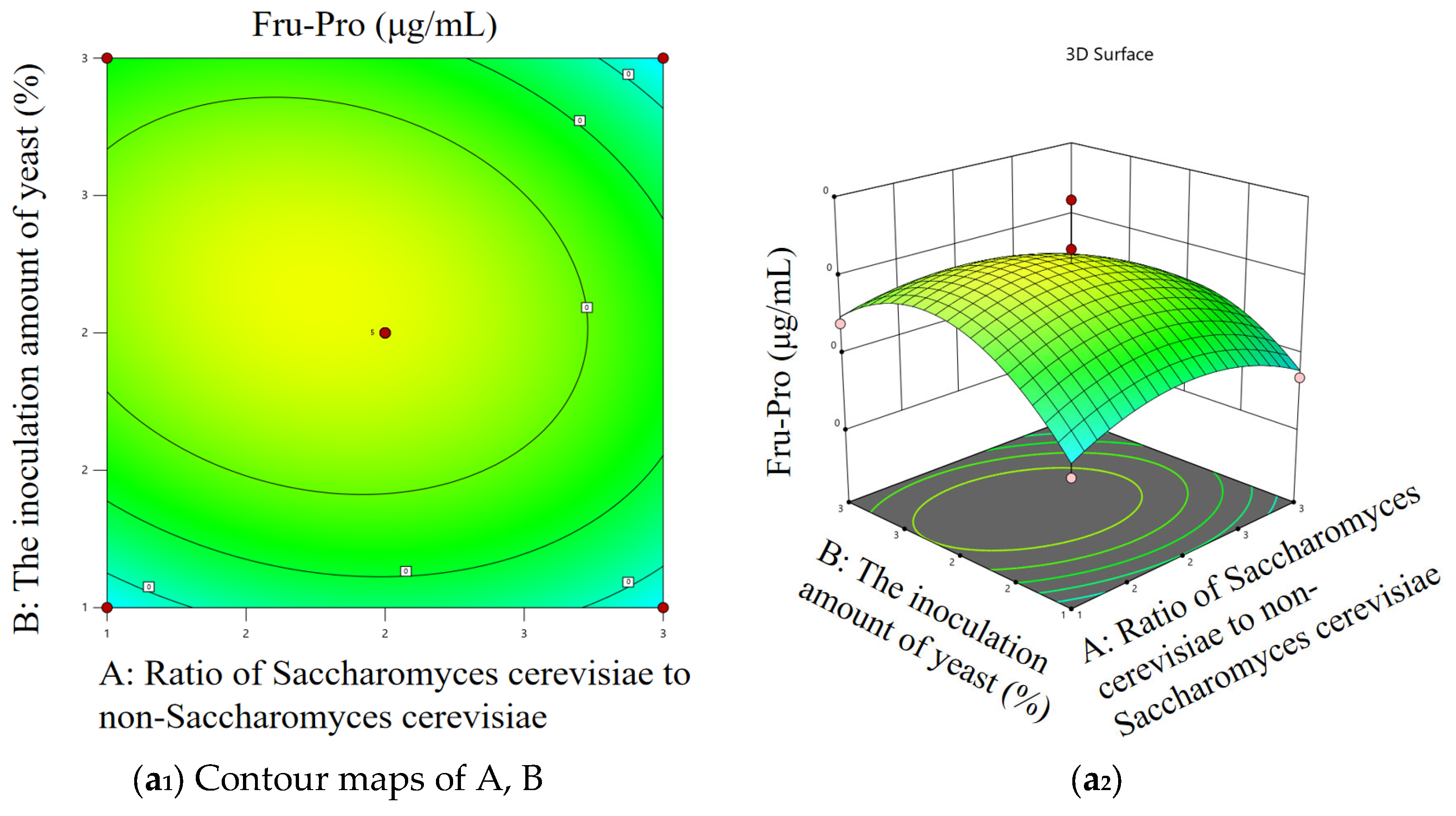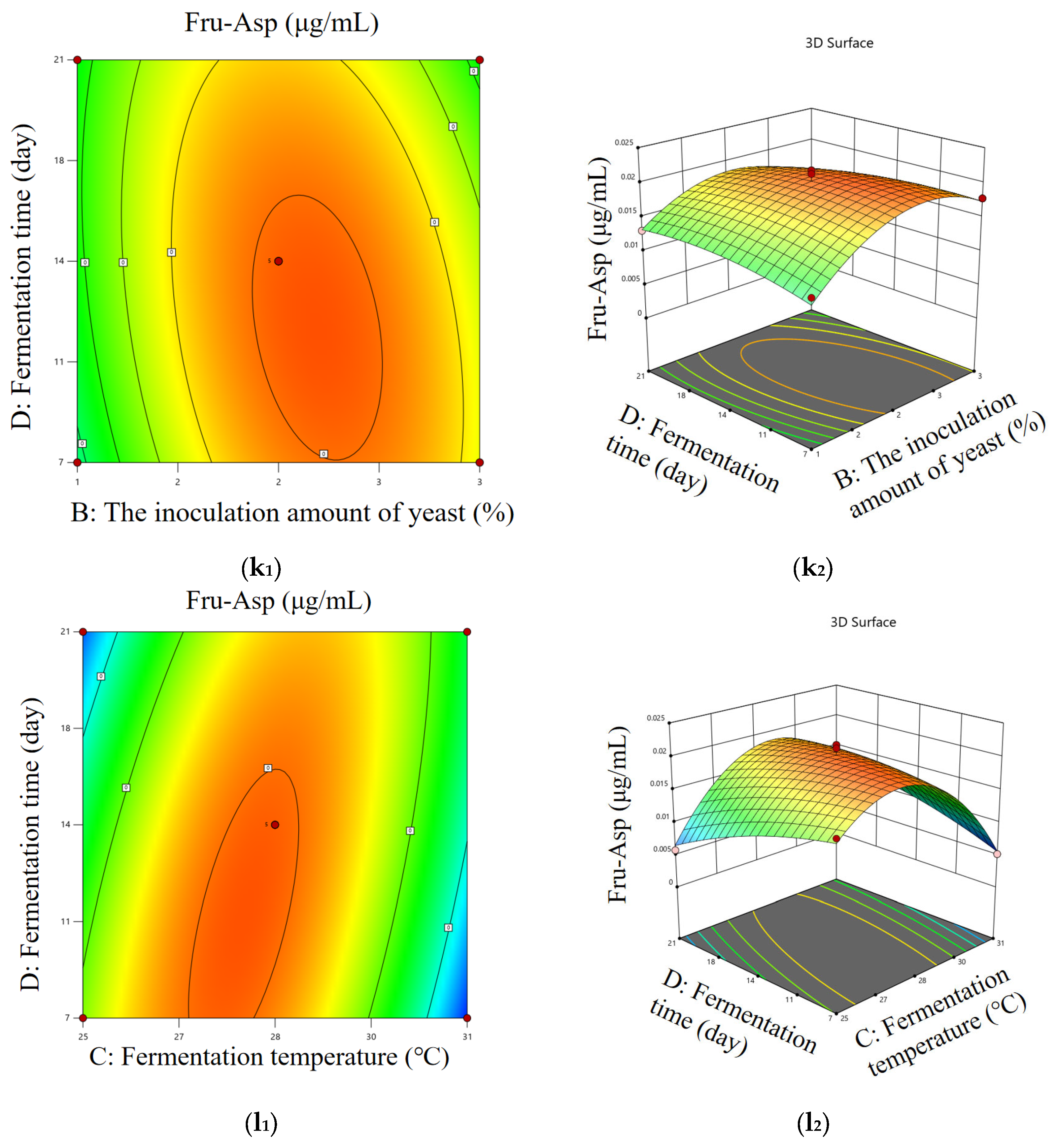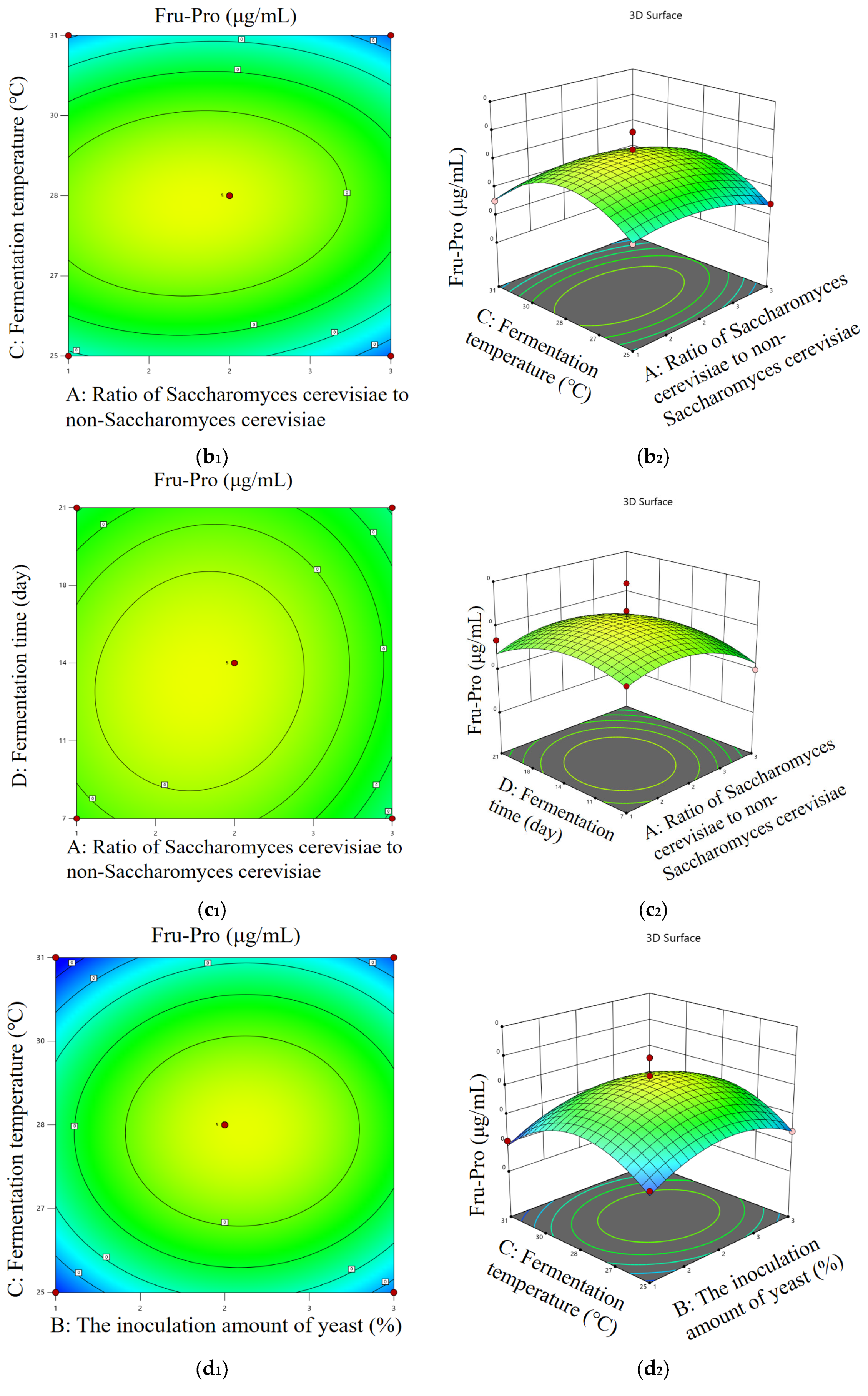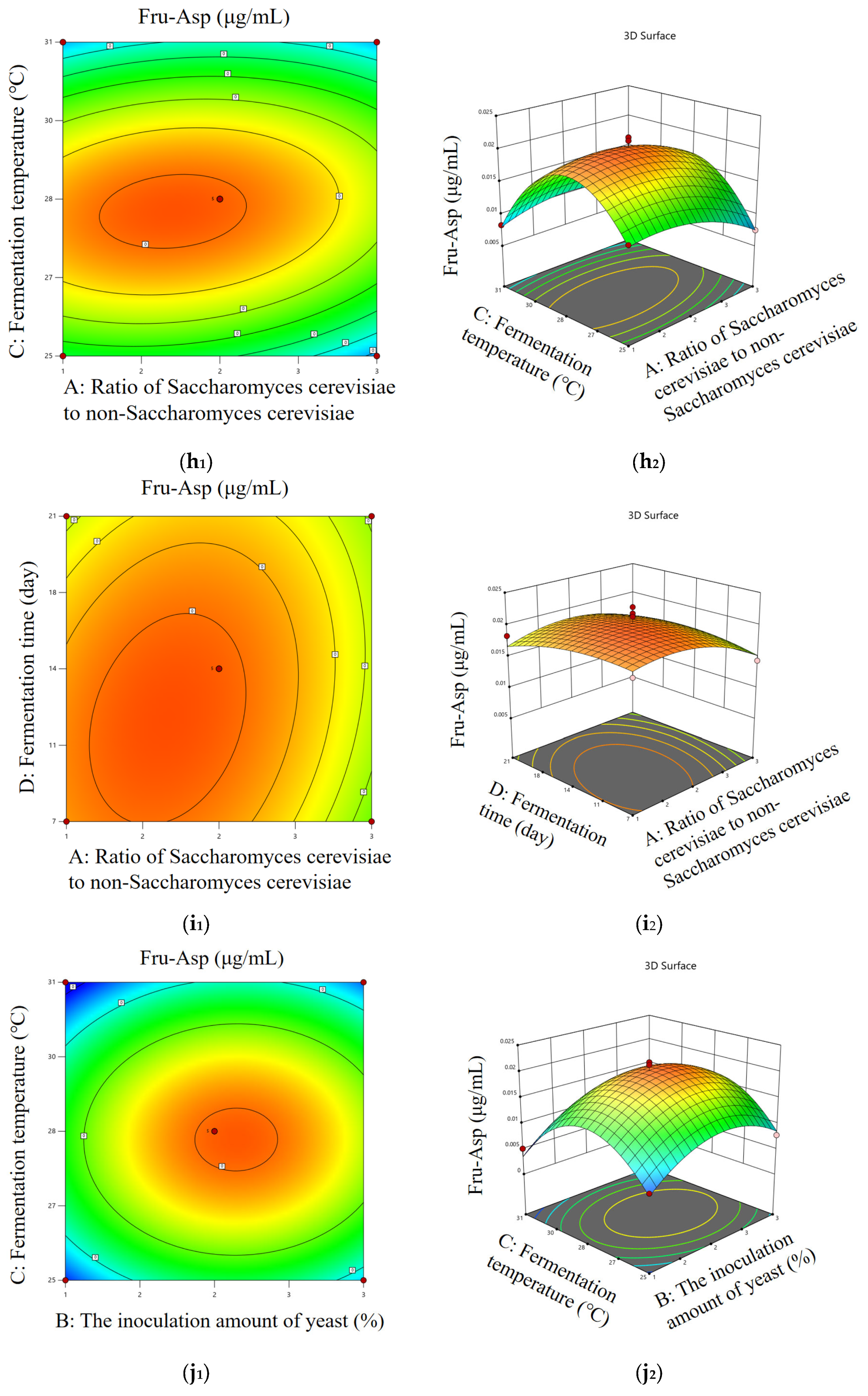 According to the optimal condition range determined by the single-factor test, the content of Fru-Pro and Fru-Asp were used as evaluation indexes. The Box–Behnken experimental design method was used to select the amount of yeast, fermentation temperature, fermentation time, and the ratio of