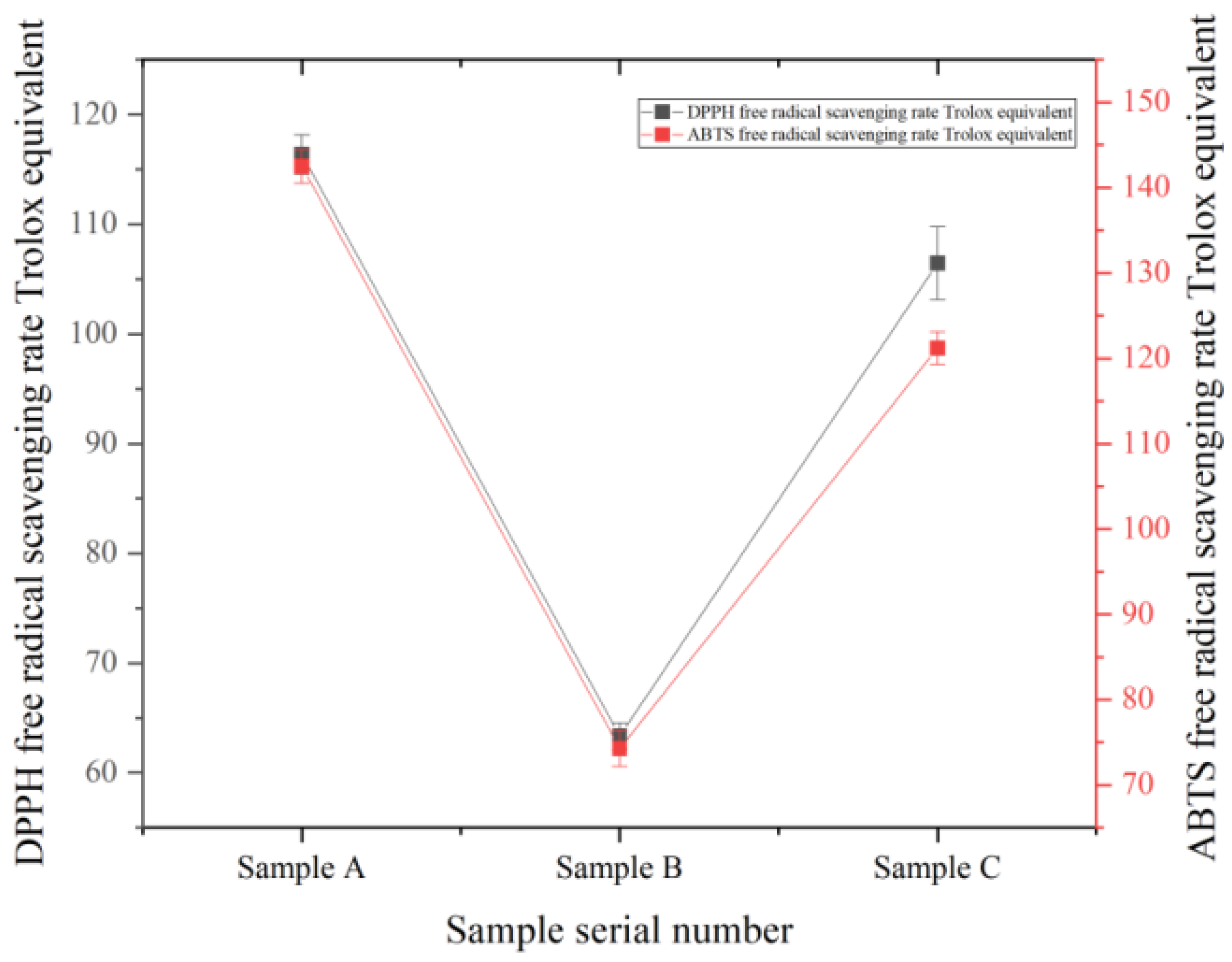 A 25 μL sample was mixed with 200 μL of freshly prepared 0.35 mmol/L DPPH/methanol solution and placed in the dark at room temperature (20–23 °C) for 2 h. Methanol was used as a blank to determine the absorbance at 517 nm. The absorbance of the sample solution was recorded as Aa, and the absorbance of the blank was recorded as Ab. Trolox was dissolved in methanol with a concentration gradient of 0, 10, 20, 30, and 40 μg/mL [