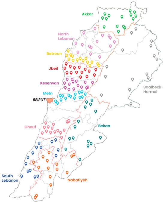 Northern rural zones (Akkar, North Lebanon) depend on farming yet struggle with banned agrochemicals, pesticides residues, untreated discharges, and weak waste management [8,9]. The Bekaa Valley and Baalbeck-Hermel are agricultural heartlands but face soil and water pollution due to fertilizer overuse and agricultural runoff, industrial pollution, and inadequate waste treatment [10,11,12].