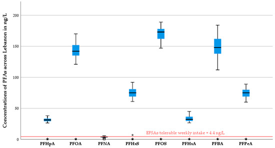 Boxplots of the Concentrations of the various perfluoroalkyl carboxylic acid (PFAs) in Lebanon. *: extremely outlying value where the difference from other values is highly significant and it falls much farther away from the whiskers of the plot.