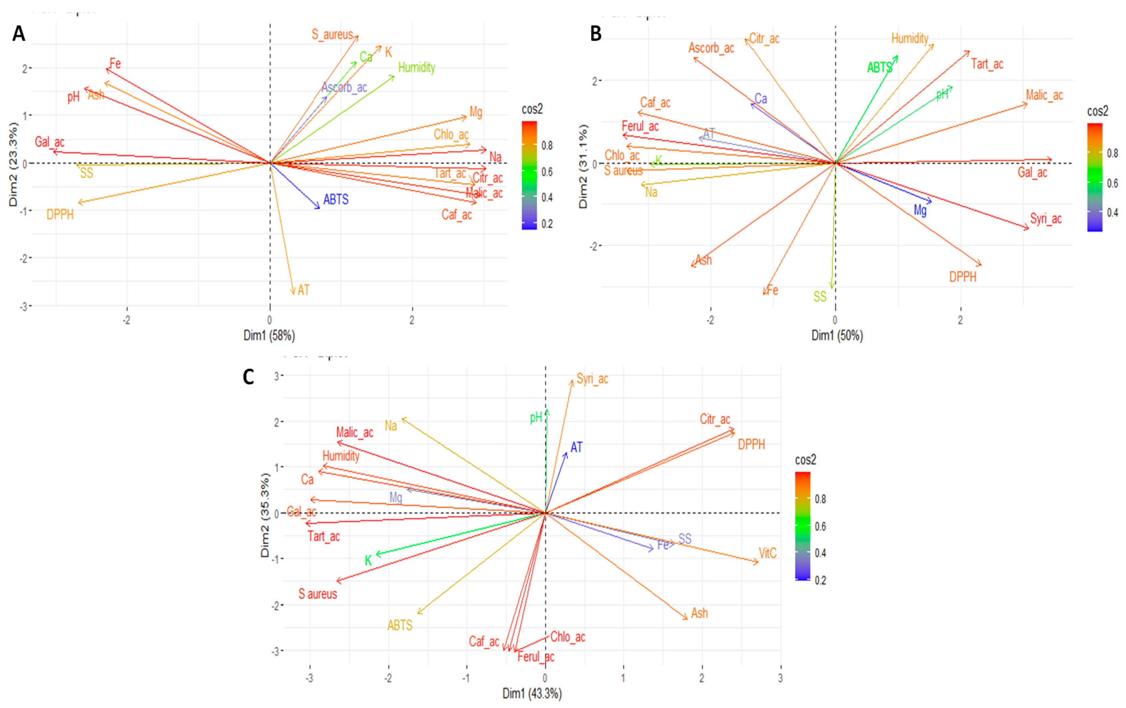 Vitamin C (mg/100 g DW) | 12.2 ± 0.6 a | 11.7 ± 1.12 a | 12.1 ± 0.0 a | 3.5 ± 0.2 a | 1.5 ± 0.1 b | 1.6 ± 0.1 b | 11.4 ± 0.6 b | 16.8 ± 0.9 a | 15.9 ± 0.6 a | *** | *** | *** |