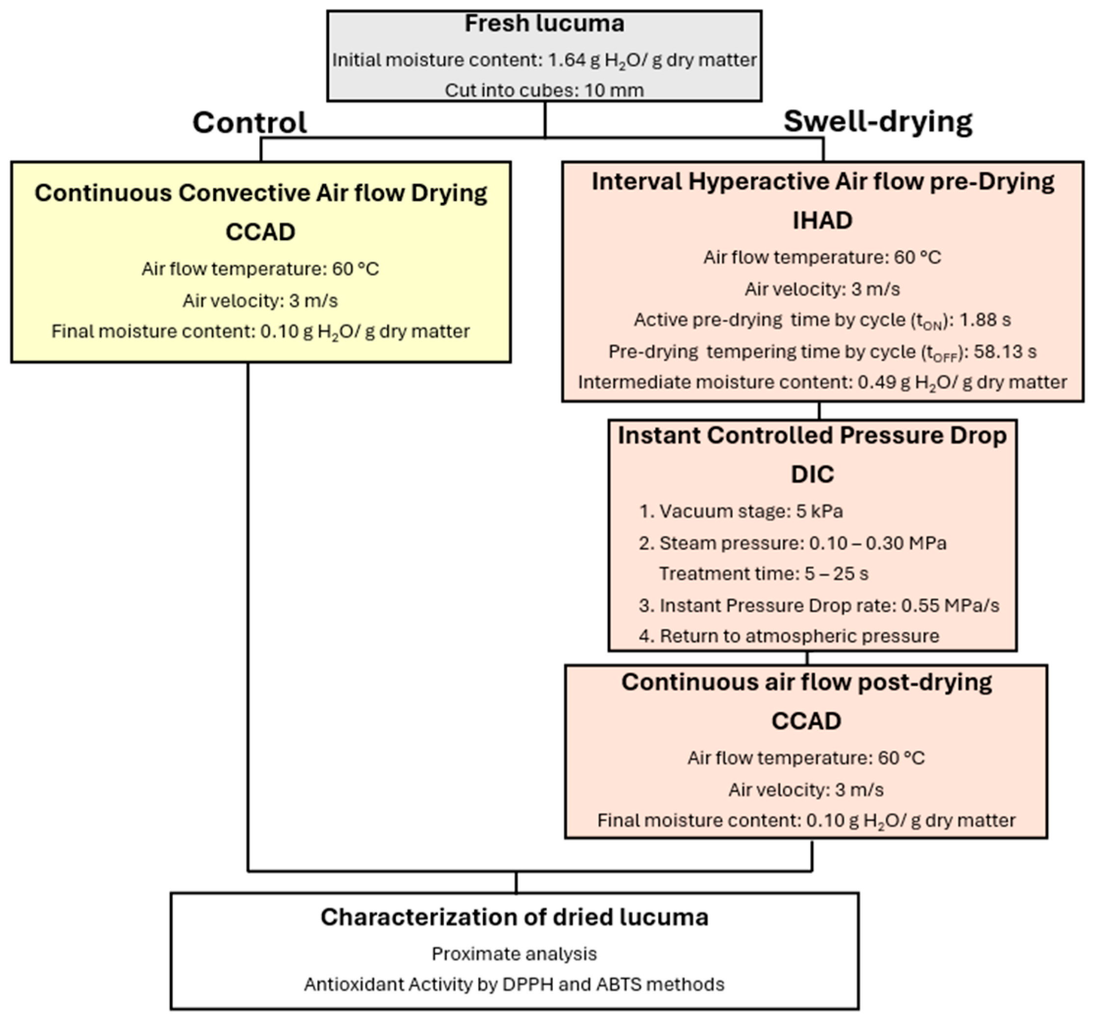 1] indicate that ripe lucuma is rich in carotenoids (0.15 mg β-carotene equivalent/g dw), phenols (69.3 mg gallic acid equivalent/g dw), sterols (6.5 μg β-sitosterol/g dw and 0.86 μg cycloartenol/g dw), α-amyrin (25.4 μg/g dw), myo-inositol (3.17 mg/g dw), and α-tocopherol (5.1 mg/100 g dw). In this regard, it can be noted that after swell-drying, the yellow-orange color of lucuma pulp was maintained, which may indicate good preservation of carotenoids. Therefore, future studies could analyze the impact of IHAD and DIC on each of these molecules and their relation to the antioxidant activity of dried lucuma.