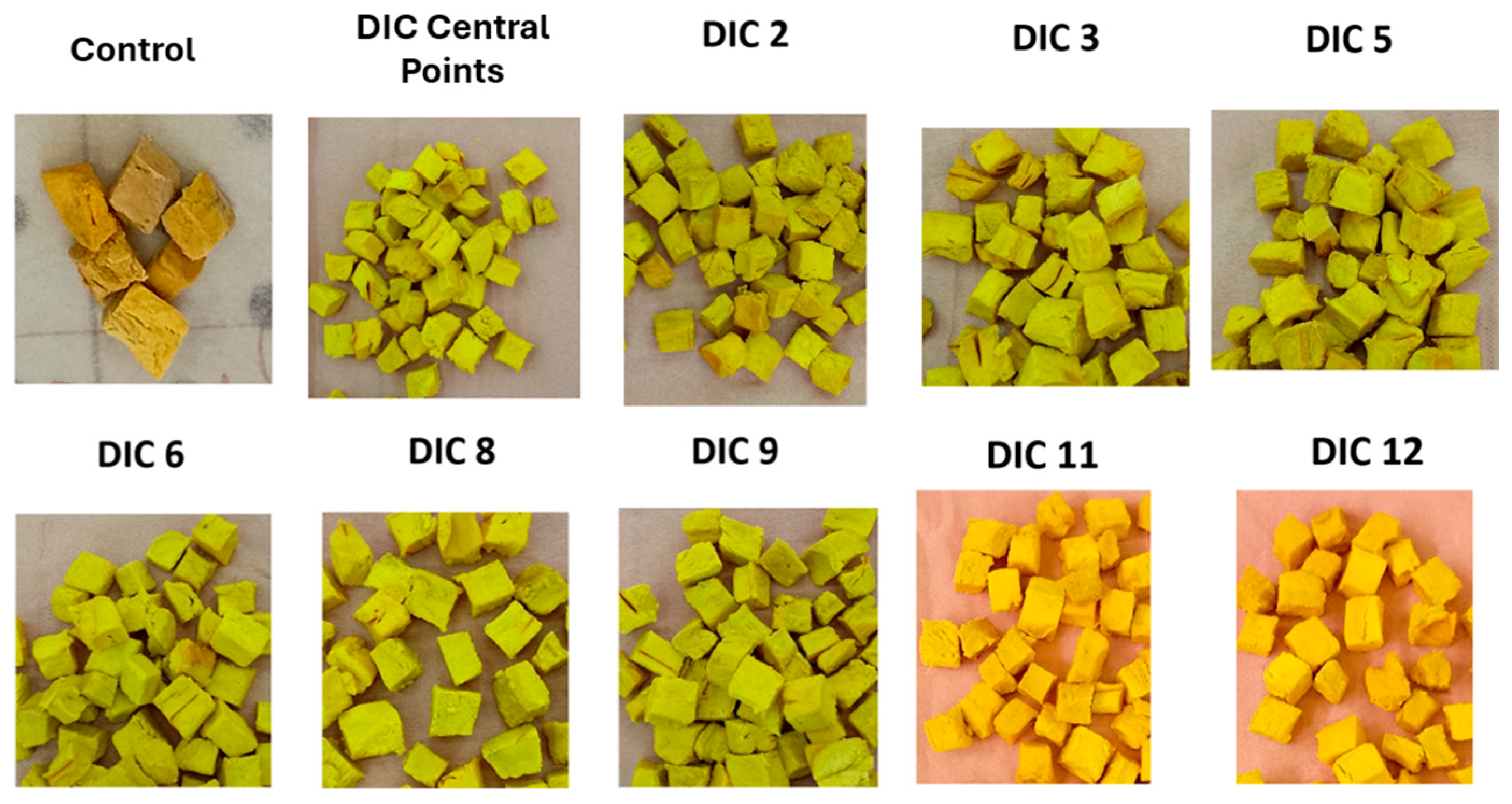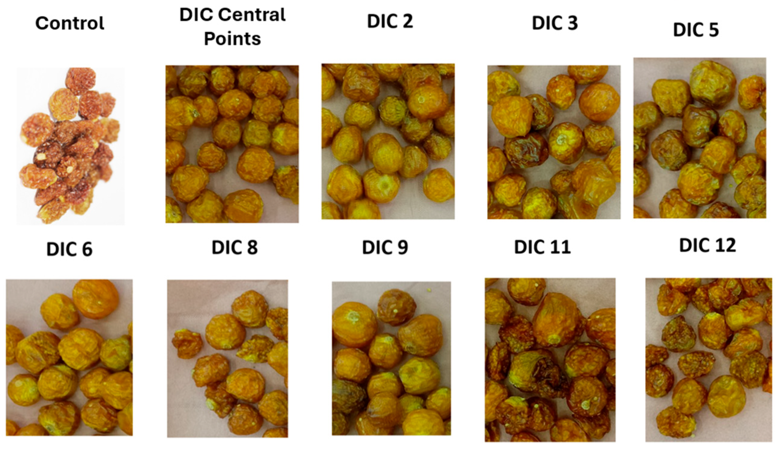 Table 5, the fiber reduction observed in the DIC 3 goldenberry sample may be associated with the longest thermal treatment time applied (55 s), which could have triggered hydrolysis and structural fiber damage. Future studies should include additional trials to better clarify the impact of extended treatment times on goldenberry nutrients.