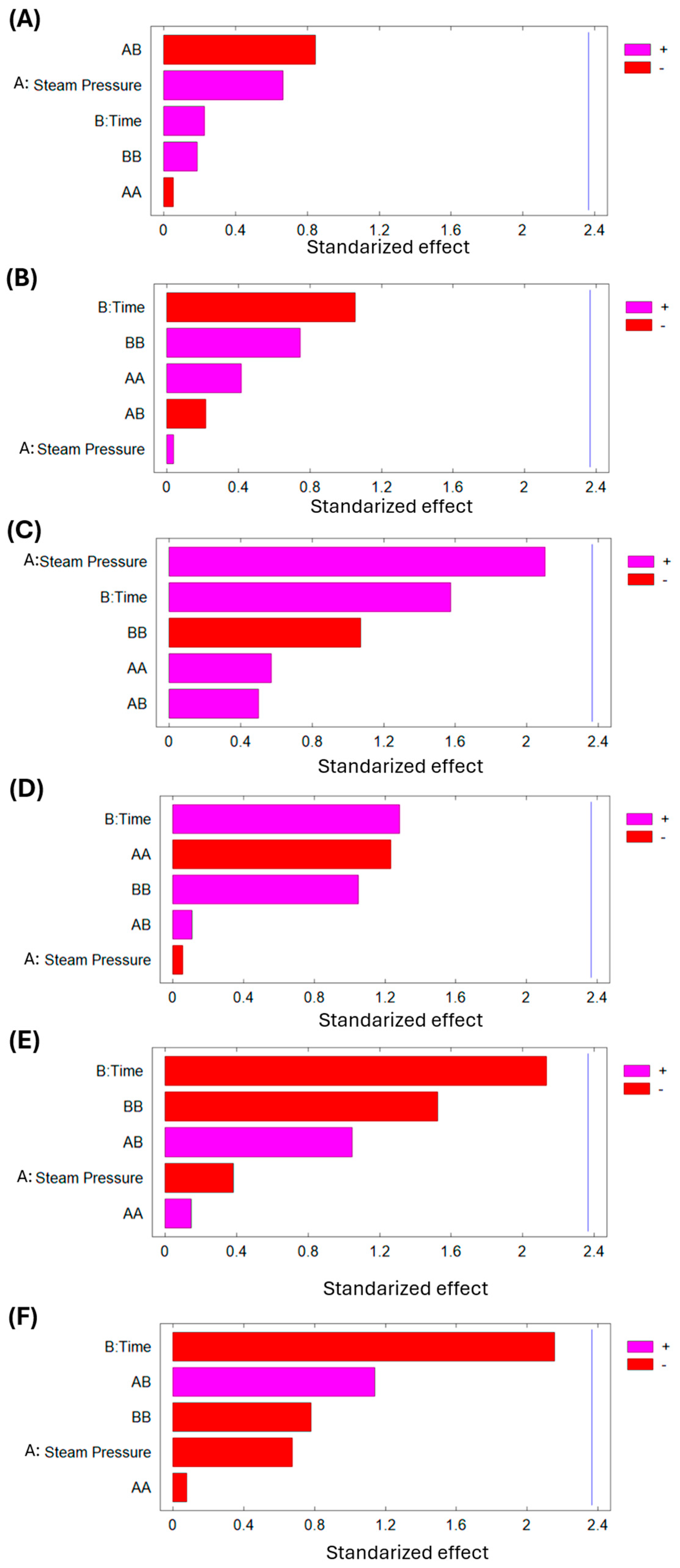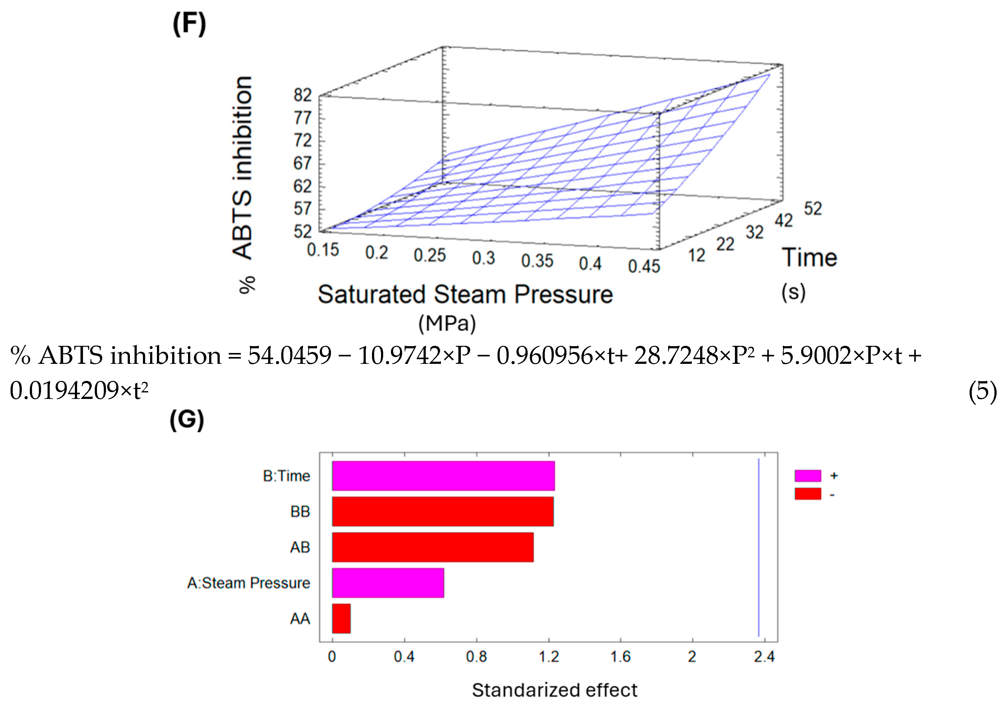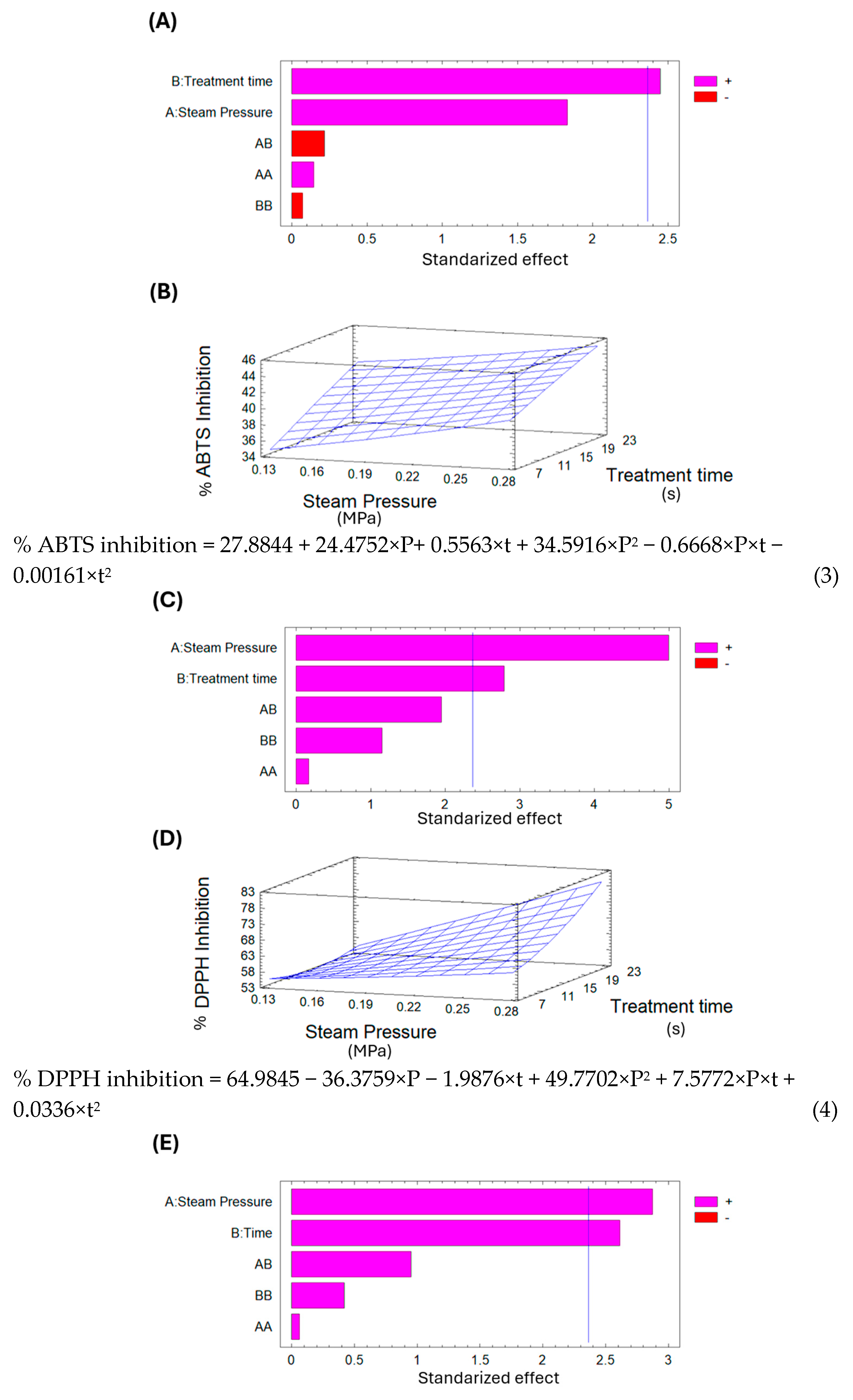 Figure 9E indicates that both saturated steam pressure and treatment time influence the percentage of ABTS inhibition. Additionally, the surface response graph in