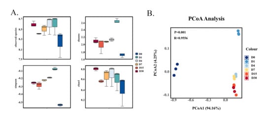 Alpha diversity analysis and beta diversity analysis were performed based on the ASV feature sequence and ASV abundance table obtained from 2.2. Alpha diversity’s core lies in the comprehensive assessment of species richness, distribution uniformity, and completeness of sequencing data []. Figure 1A lists the core analysis parameters, including the observed_otus, Shannon, Simpson, and chao1 (logarithmic normalization of raw data was adopted for plotting). As the fermentation process progressed, chao1 increased, indicating a rise in community richness. In contrast, Shannon decreased, reflecting a reduction in community diversity. Beta diversity refers to the variation in species composition among different environmental communities []. PCoA was employed to examine the differences and similarities among samples. PCoA1 and PCoA2 contributed 94.16% and 4.25% to the OTU data difference. As illustrated in Figure 1B, the samples from D4 to D30 were closely clustered, particularly D4 and D7, as well as D15 and D30, indicating similarities in their microbial structures. In contrast, the samples from D0 and D1 were distinctly separated from all other sample groups, suggesting that the microbial composition of these two groups significantly differs from the others.