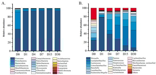 Changes in bacterial community structure at the phylum (A) and genus (B) levels during sour bamboo shoots fermentation. All measurements were performed with three replicates.
