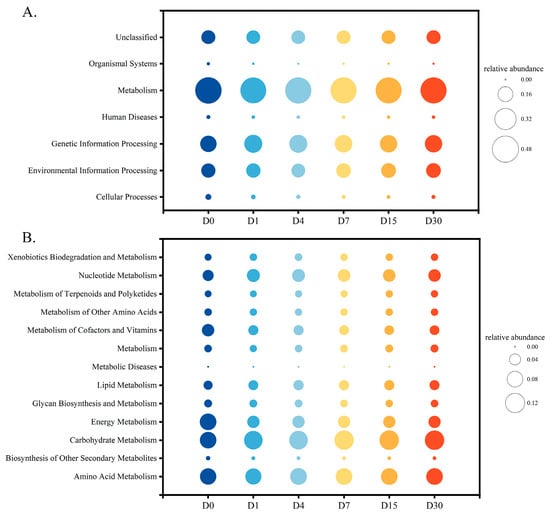Predicted KEGG functional abundance of the sour bamboo shoot bacterial community based on KEGG level 1 (A) and KEGG level 2 (B). The size of bubbles corresponds to the relative abundance of functions, and the colors represent different functions.