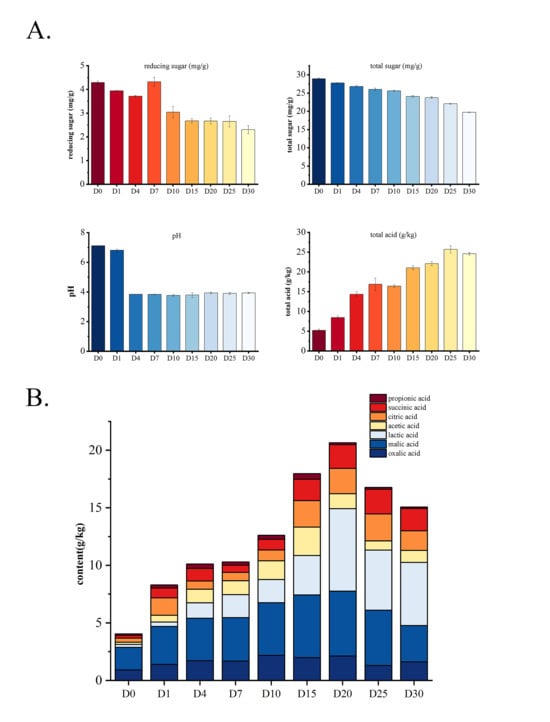 As shown in Figure 4A, the final content of reducing and total sugars decreased during fermentation, consistent with Guan et al. [] and Singhal et al. []. This may be due to the increasing abundance of carbohydrate metabolic functions in the community (Figure 3B). However, reducing sugar content increased on day 7, probably because the rate of hydrolysis of total sugar into reducing sugars surpassed the rate of bacterial consumption of reducing sugars, leading to a transient accumulation of reducing sugars. The pH value of sour bamboo shoots decreased rapidly to 3.84 after the 4th day of fermentation and then tended to be stable. Total acid accumulated continuously and reached 28.35 g/kg but decreased to 26.19 g/kg on day 30.