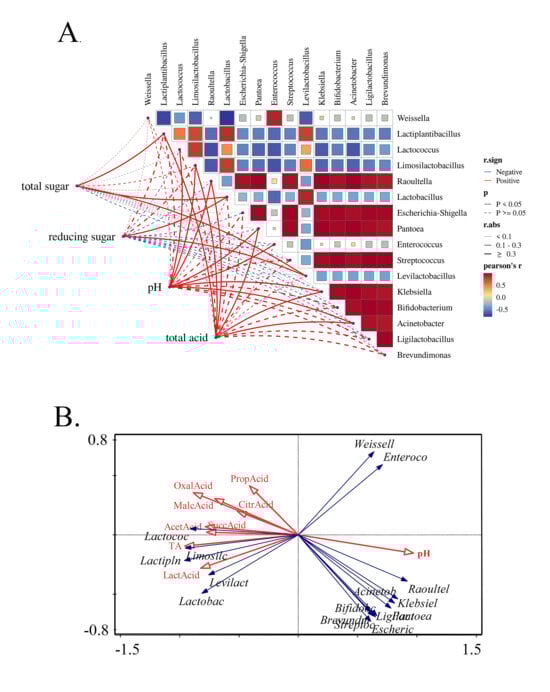 Pearson and coor.test were used to calculate the correlations among microorganisms and distance matrix correlations between microorganisms and environmental factors, and Figure 5 and a correlation coefficient table (Tables S1 and S2) were obtained. In Figure 5A, the heat map on the right shows the correlation between microorganisms. It reveals that Weissella was positively correlated with Enterococcus and Raoultella and significantly negatively correlated with other LAB (r < −0.6) within the sour bamboo shoots system. There was a positive correlation among Lactiplantibacillus, Lactococcus, Limosilobacillus, Lactobacillus, and Levilactobacillus (r = 0.36–0.90). At the same time, these five LAB genera were negatively correlated (r = −0.70 to −0.28) with Enterobacteriaceae, a negative correlation between LAB and Enterobacteriaceae that has also been reported in Mahewu [], fermented carrot juice [], and kimchi []. From the network diagram on the left in Figure 5A, there are only 11 pairs of statistically significant relationships that exist between the two distance matrices, including 4 correlations with total acid and microbial genera, 2 with pH and microbial genera, 3 with total sugar and microbial genera, and 2 with reducing sugar and microbial genera. This result indicates that pH and total acids are important indicators affecting microorganisms [,]; the direct regulation of the acid–base environment on the bacterial structure was significantly stronger than that of the carbon source.