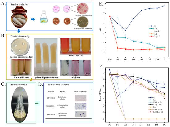 Screening of key strains (A–D) in sour bamboo shoots and changes in pH (E) and population (F) of strains in mono-culture and co-culture systems. Considering the size and aesthetic appeal of the figure, Enterobacter asburiae, Levilactobacillus spicheri, and Lactiplantibacillus plantarum are abbreviated as E., L.s, and L.p, respectively.
