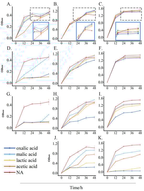 The effects of oxalic acid, malic acid, lactic acid, and acetic acid at concentrations of 0.5‰ (A–C), 2‰ (D–F), 4‰ (G–I), and 8‰ (J,K) on the growth of Enterobacter asburiae (A,D,G), Levilactobacillus spicheri (B,E,H,J), and Lactiplantibacillus plantarum (C,F,I,K). Biomass was expressed as OD600, and each measurement was repeated three times. The blue box was an enlarged representation of the black box (A–C).