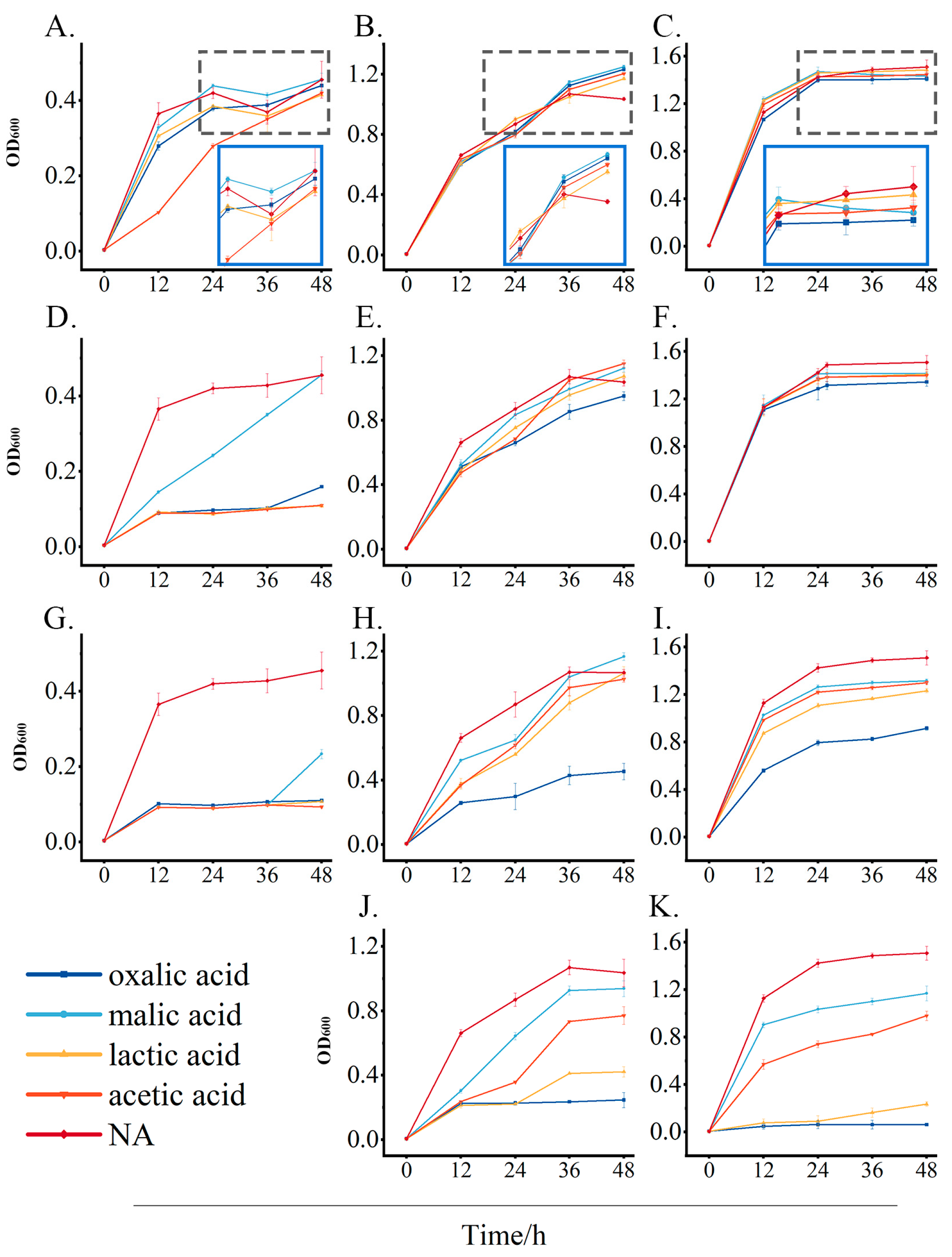 3.7. Analysis of Concentration-Dependent Effects of Organic Acids on Growth Inhibition and Promotion of Isolated Strains