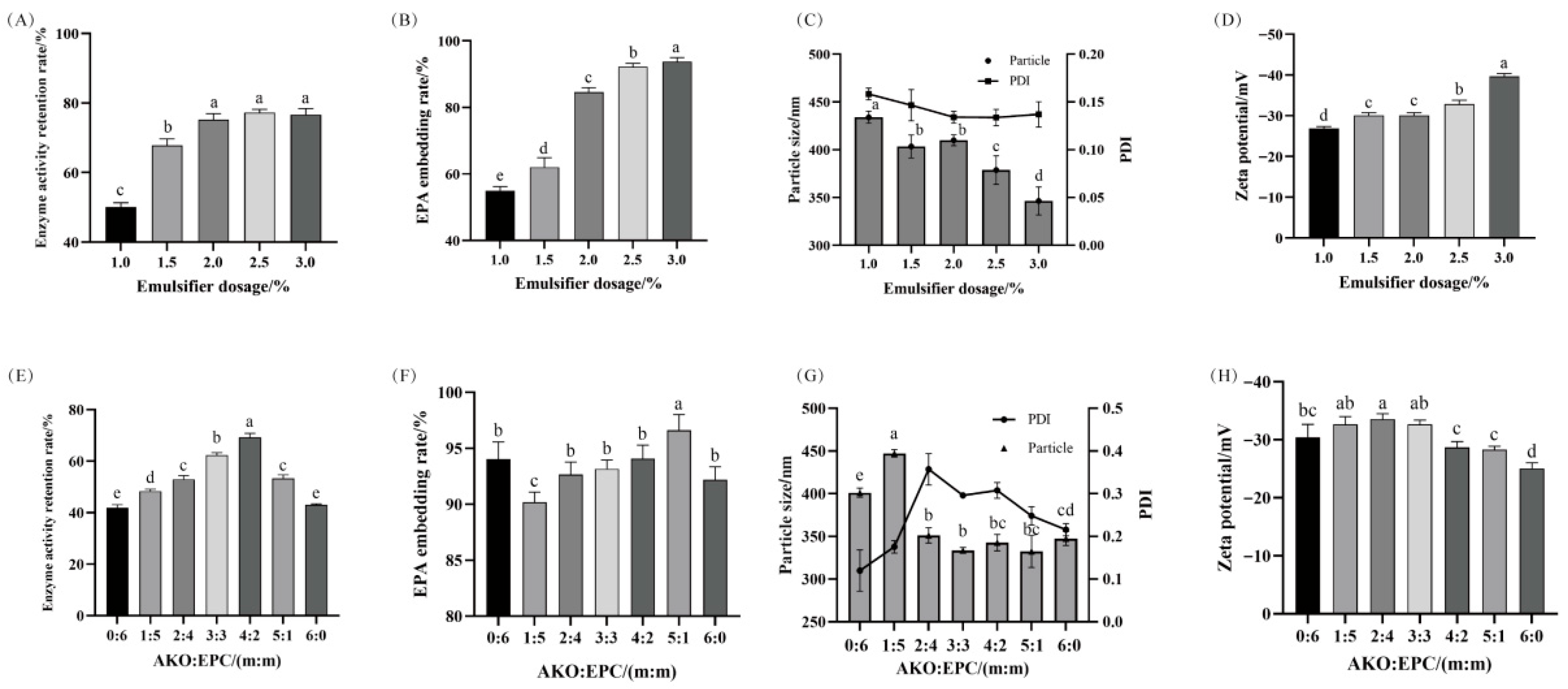 Effect of emulsifier addition mix ratio on EPA-NK nanoemulsions.(A) Effect of emulsifier addition level on NK activity retention rate; (B) Effect of emulsifier addition level on EPA embedding rate; (C) Effect of emulsifier addition level on particle size and PDI; (D) Effect of emulsifier addition level on Zeta potential; (E) Effect of emulsifier mixing ratio on NK activity retention rate; (F) Effect of emulsifier mixing ratio on EPA embedding rate; (G) Effect of emulsifier mixing ratio on particle size and PDI; (H) Effect of emulsifier mixing ratio on Zeta potential. Different letters (a–e) in (A–H) represent significant differences among samples (p < 0.05).