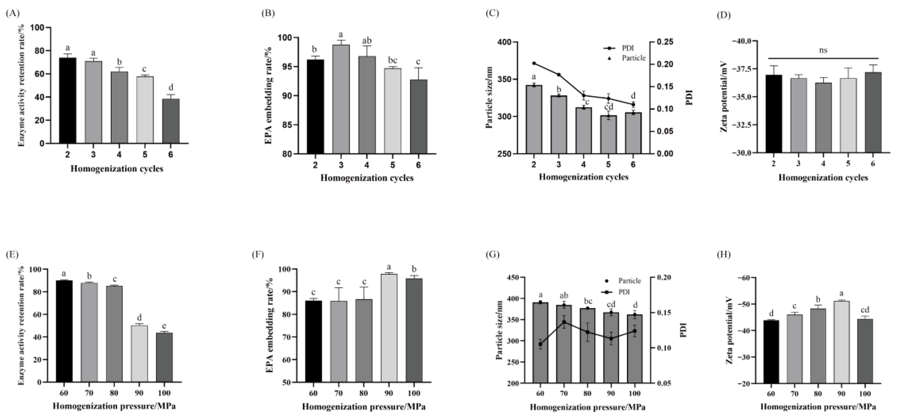 Effect of homogenization cycle times and homogenization pressure on EPA-NK nanoemulsions. (A) Effect of high-pressure homogenization cycles on NK activity retention rate; (B) Effect of high-pressure homogenization cycles on EPA embedding rate; (C) Effect of high-pressure homogenization cycles on particle size and PDI; (D) Effect of high-pressure homogenization cycles on Zeta potential; (E) Effect of homogenization pressure on NK activity retention rate; (F) Effect of homogenization pressure on EPA embedding rate; (G) Effect of homogenization pressure on particle size and PDI; (H) Effect of homogenization pressure on Zeta potential. Different letters (a–e) in (A–H) represent significant differences among samples (p < 0.05).