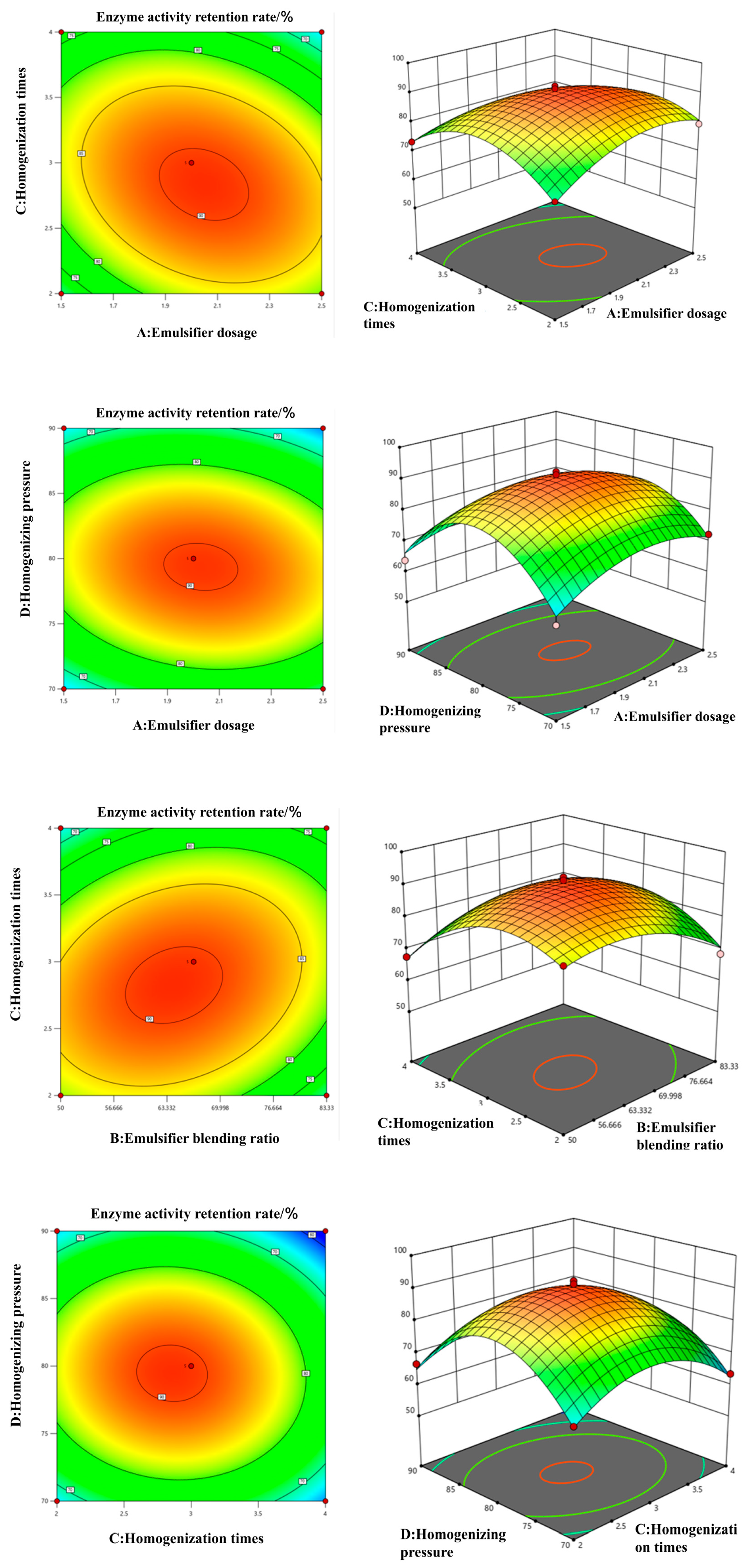 The preparation process of the EPA-NK nanoemulsion was systematically optimized. Initially, a series of single-factor experiments were conducted to identify critical formulation and process parameters and to determine their approximate optimal ranges. Based on the findings from these preliminary studies, RSM was employed for further systematic optimization. The primary objective of this optimization was to maximize the retention rate of enzyme activity, which was selected as the response value. A Box–Behnken Design (BBD) was specifically chosen for this purpose. Four independent variables were investigated: emulsifier dosage (A), emulsifier blending ratio (B), number of high-pressure homogenization cycles (C), and homogenization pressure (D). Each factor was examined at three coded levels: −1 (low), 0 (medium), and +1 (high), with the specific values for these levels detailed in