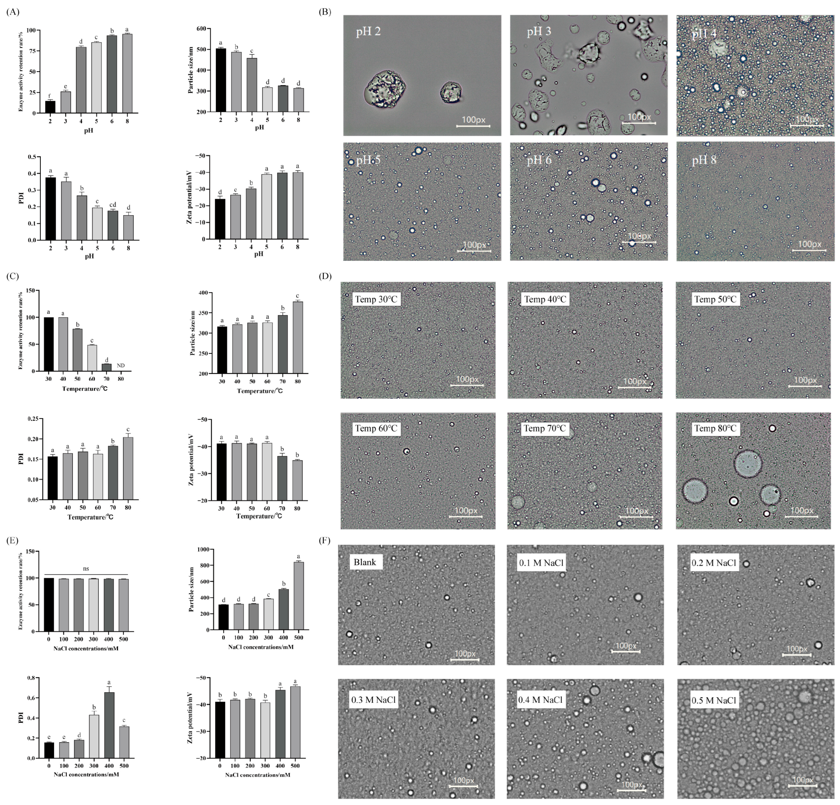 Effect of pH, temperature and salt ion on EPA-NK nanoemulsion. (A) Effect of pH on enzyme activity retention rate, particle size, PDI and Zeta potential. (B) Different pH values on the macrostructure (pH values from left to right are 2–8). (C) Effect of temperature on enzyme activity retention rate, particle size, PDI and Zeta potential. (D) Different temperatures on the macrostructure (The salt temperature from left to right is 30–80 °C, respectively). (E) Effect of salt ion on enzyme activity retention rate, particle size, PDI and Zeta potential. (F) Effect of salt ion on the macrostructure (The salt ion concentrations from left to right are 0–500 mmol/L, respectively). Different letters (a–e) in (A,C,E,F) represent significant differences among samples (p < 0.05). ‘ns’ denotes “Not Significant,” indicating no statistically significant difference (typically with a p-value > 0.05), while ‘ND’ generally stands for “Not Detected.”