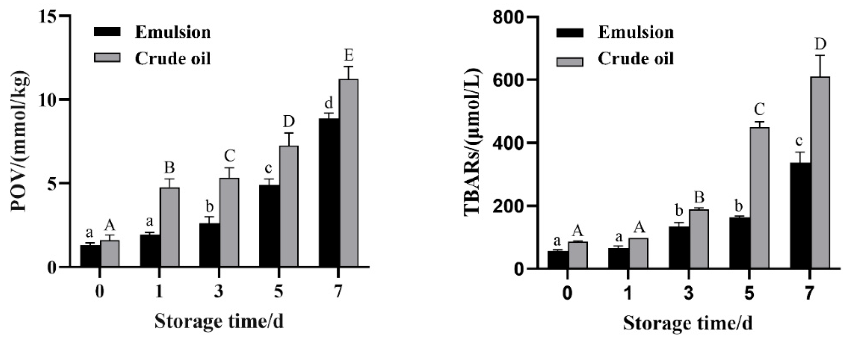 The contents of POV (left) and TBARs (right) of EPA-NK nanoemulsion changed with accelerated oxidation. Uppercase letters ABCD denote statistical comparisons within the crude oil group, while lowercase letters abcd represent comparisons within the emulsion group; a significance level of p < 0.05 is used to indicate statistically significant differences between groups.