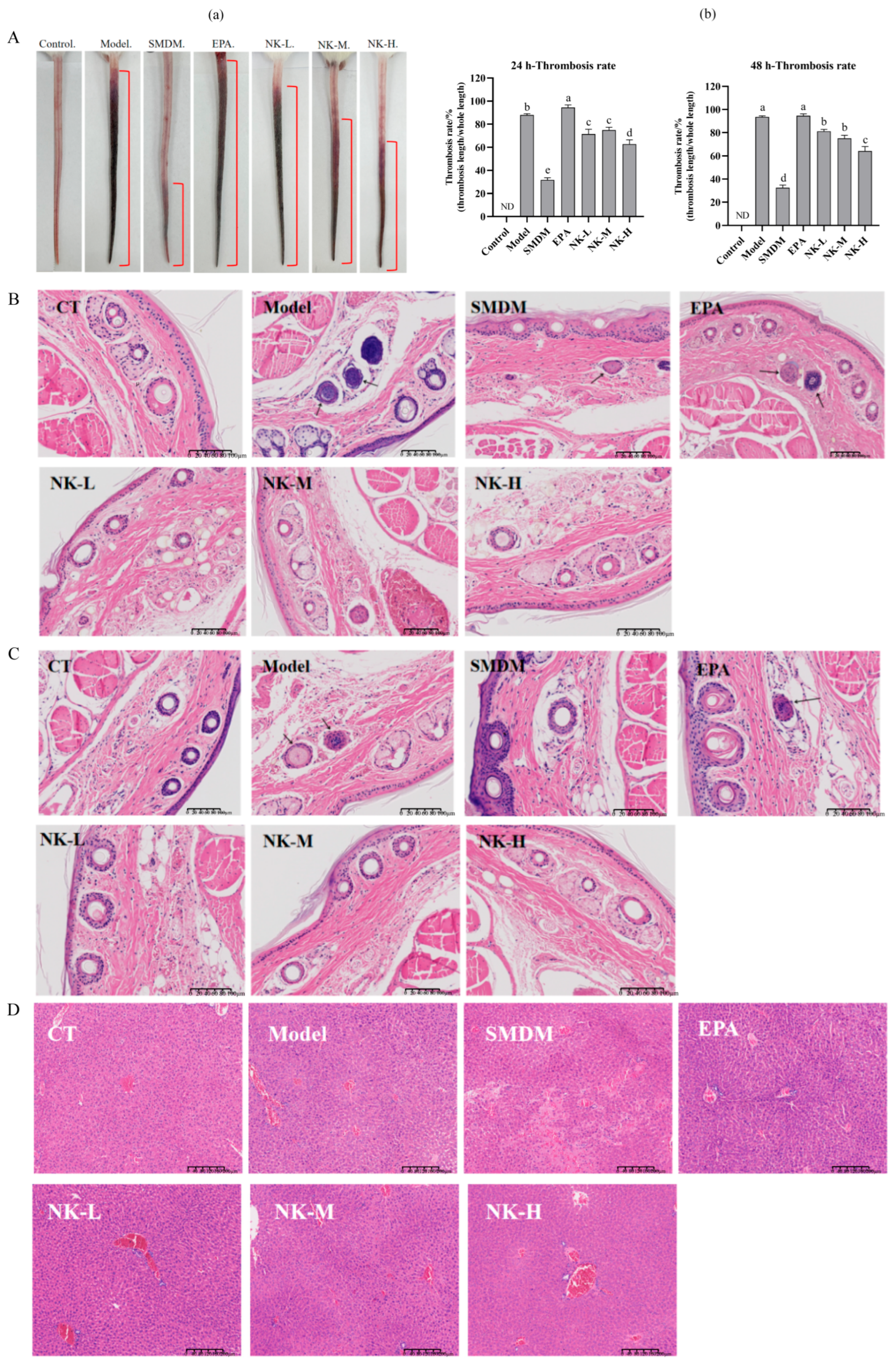 (A) Appearance of black-tailed mice 48 h after modeling (a), black-tail formation rate of mice in different periods (b). (B) H&E staining results of mouse tail blood vessels (3 cm from tail tip). (C) H&E staining results of mouse tail blood vessels (5 cm from the tail tip). (D) H&E staining results of mouse tail blood vessels (5 cm from the tail tip). Different letters (a–e) represent significant differences among samples (p < 0.05). And ‘ND’ denotes “Not Detected.”
