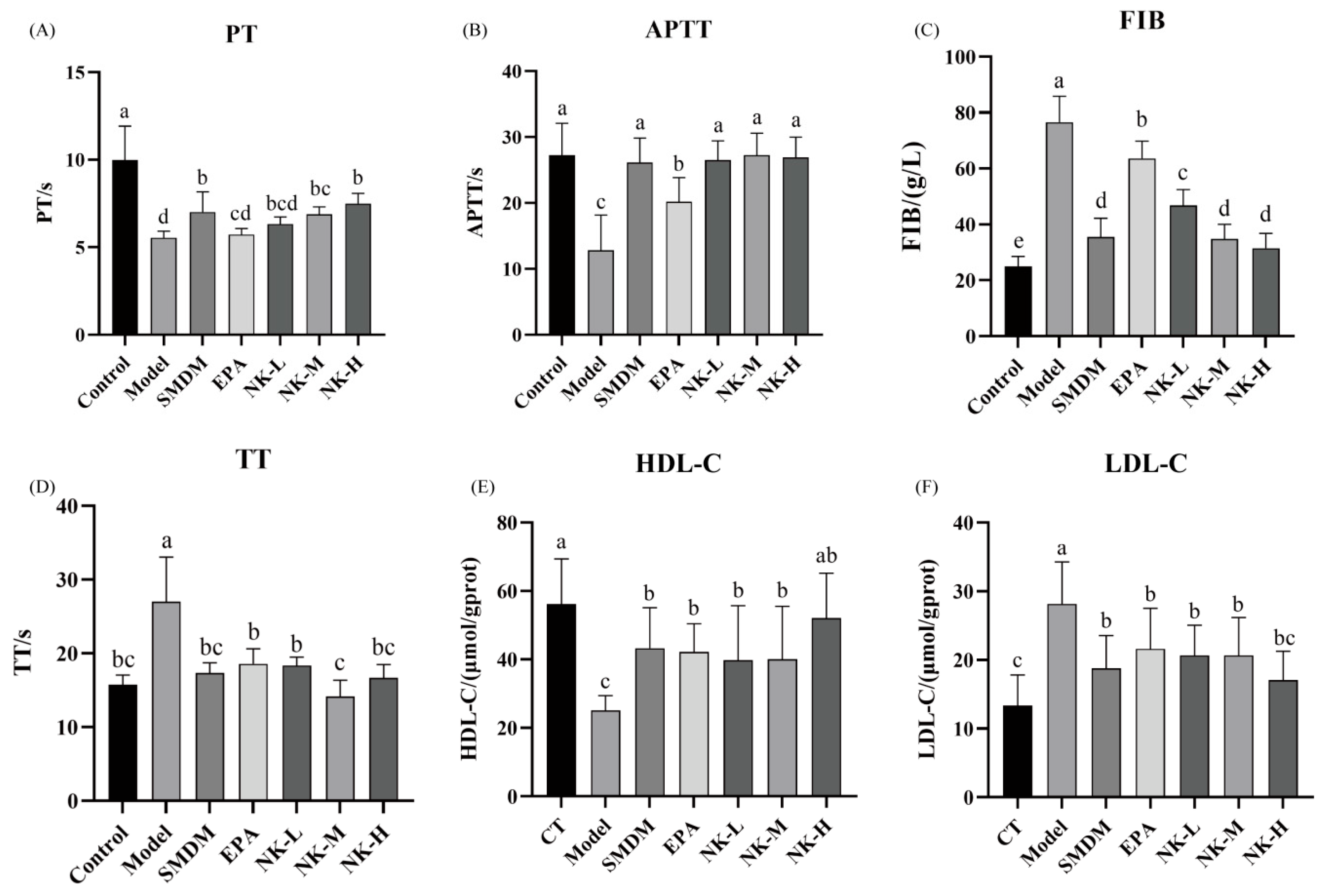 Changes in four indices of blood coagulation and high- and low-density lipoprotein content in mice. (A) PT. (B) APTT. (C) FIB. (D) TT. (E) HDL-C. (F) LDL-C. Different letters (a–e) in (A–F) represent significant differences among samples (p < 0.05).