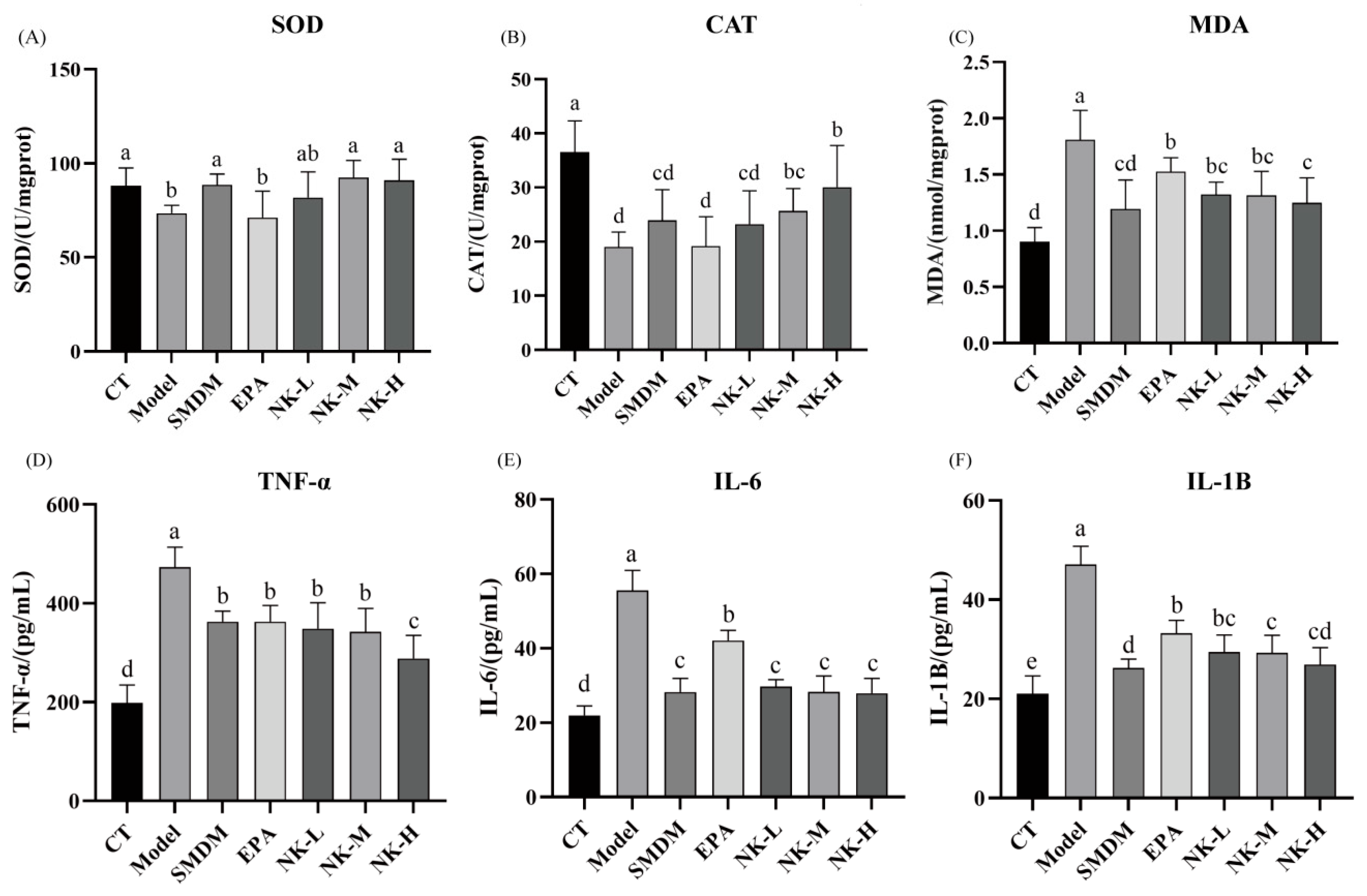 Changes in oxidative stress and inflammatory factors levels in mice. (A) SOD. (B) CAT. (C) MDA. (D)TNF-α. (E) IL-6. (F) IL-1β. Different letters (a–e) in (A–F) represent significant differences among samples (p < 0.05).