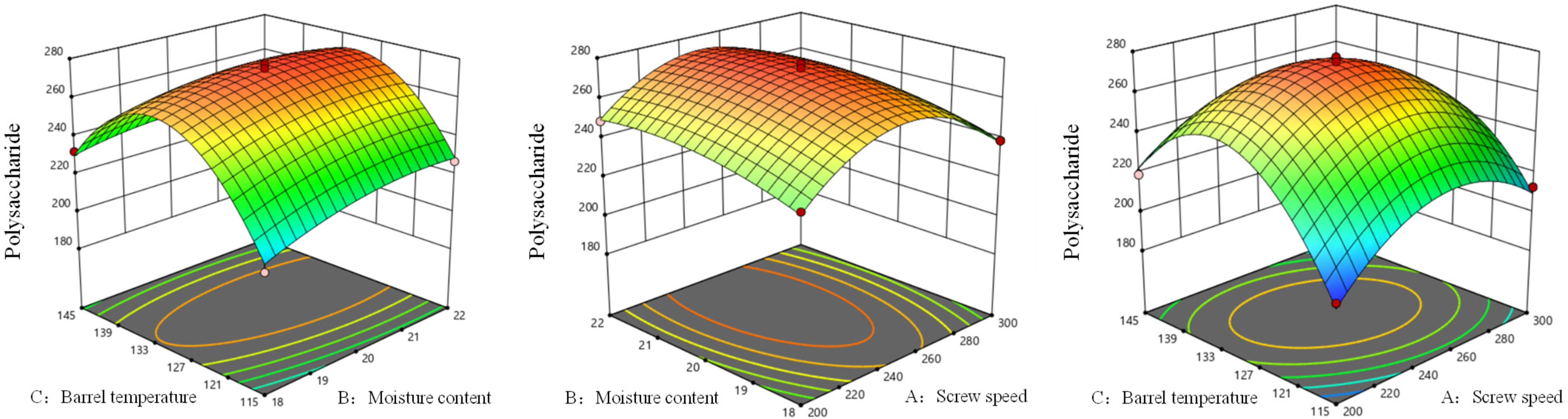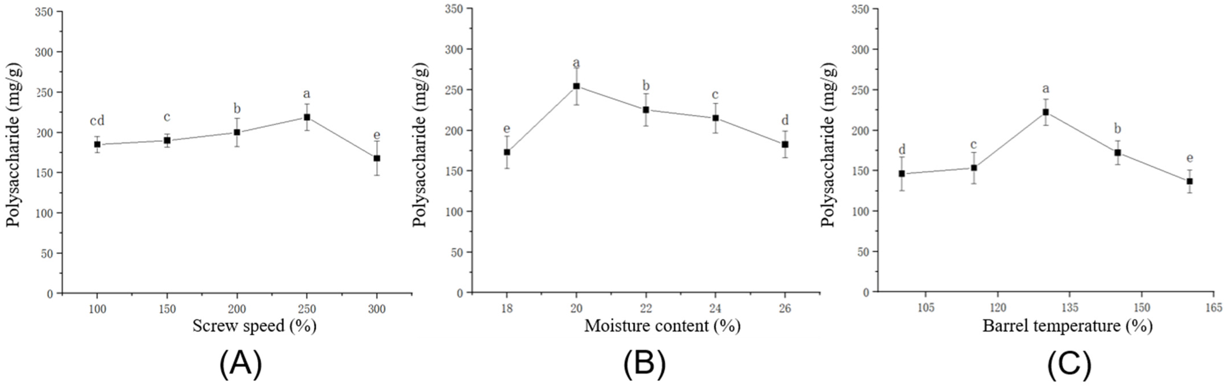 During the processing of Codonopsis pilosula using a twin-screw extruder, the barrel temperature, screw speed, and material moisture content were the three primary factors influencing its internal bioactive components. Single-factor experiments were conducted to investigate these factors. The extrusion process was initially performed with a barrel temperature of 130 °C, a screw speed of 200 rpm, and a material moisture content of 20%. Subsequently, the individual effects of barrel temperature (100 °C, 115 °C, 130 °C, 145 °C, 160 °C), screw speed (100 rpm, 150 rpm, 200 rpm, 250 rpm, 300 rpm), and material moisture content (18%, 20%, 22%, 24%, 26%) on the polysaccharide content of Codonopsis pilosula were examined.