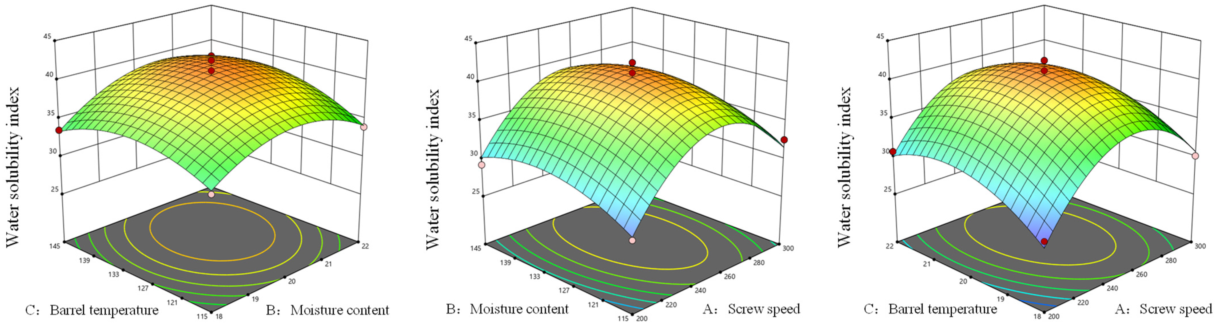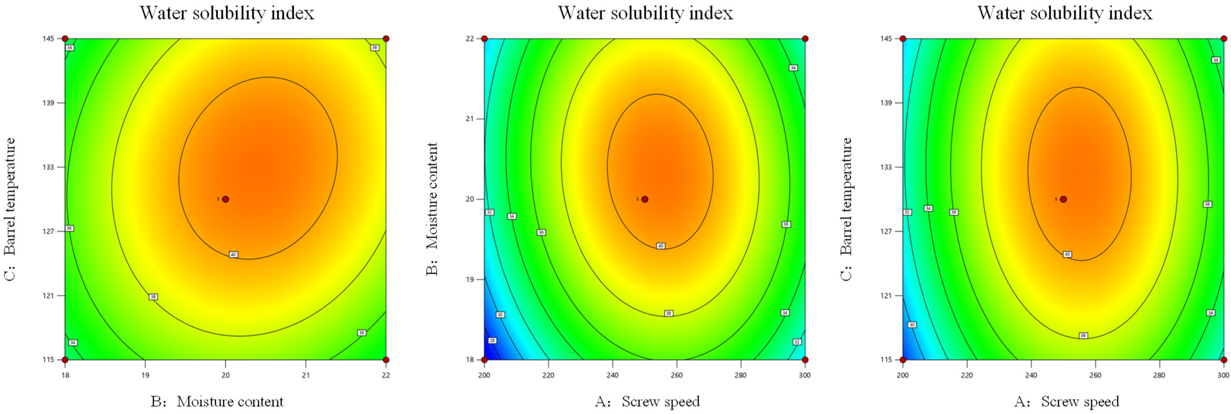 Based on the single-factor experiments, screw speed (A), material moisture content (B) and barrel temperature (C) were selected as independent variables, coded and used to design a response surface experiment (RSM) using Design-Expert 8.0.6 software. This resulted in 17 experimental runs. The coded factor levels are presented in