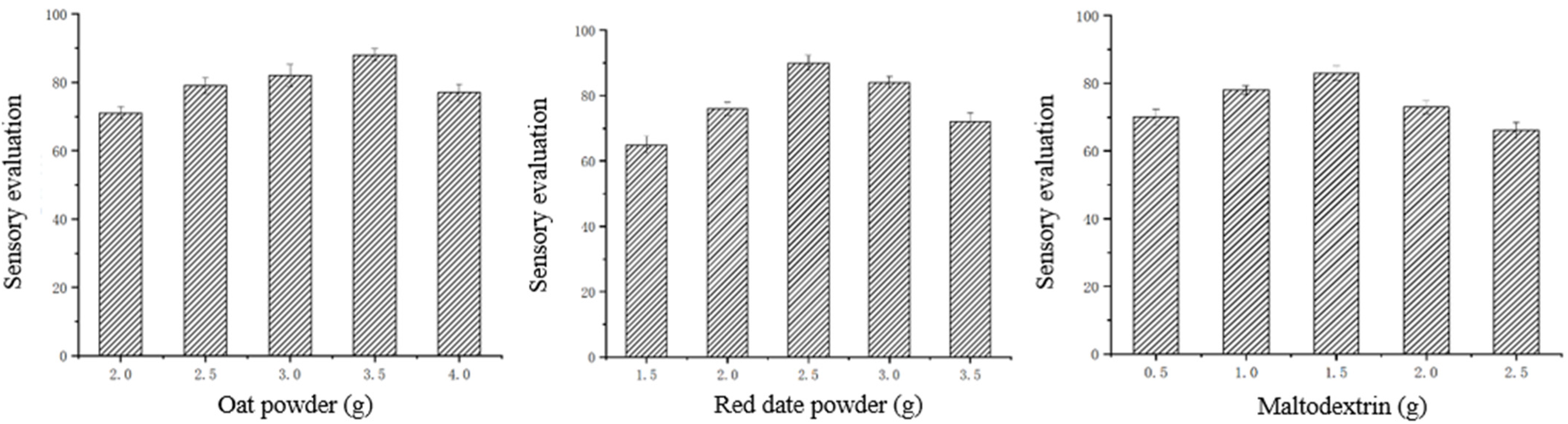 Codonopsis pilosula powder constituted the primary ingredient of the Codonopsis-oat powder, with a fixed dosage of 10 g per serving based on the permitted usage range specified in the Chinese Pharmacopoeia. By adjusting the addition levels of supplementary ingredients (oat powder, red date powder, maltodextrin), the mixture was thoroughly blended and prepared with hot water (above 80 °C). Using sensory evaluation as the indicator, we investigated the effects of oat powder, red date powder and maltodextrin addition levels, respectively, on the sensory quality of