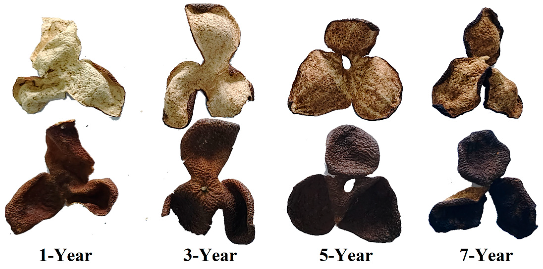 - Yang, F.; He, L.; Shen, M.; Wang, F.; Chen, H.; Liu, Y. A correlation between Pericarpium Citri Reticulatae volatile components and the change of the coexisting microbial population structure caused by environmental factors during aging. Front. Microbiol. 2022, 13, 930845. [Google Scholar] [CrossRef]