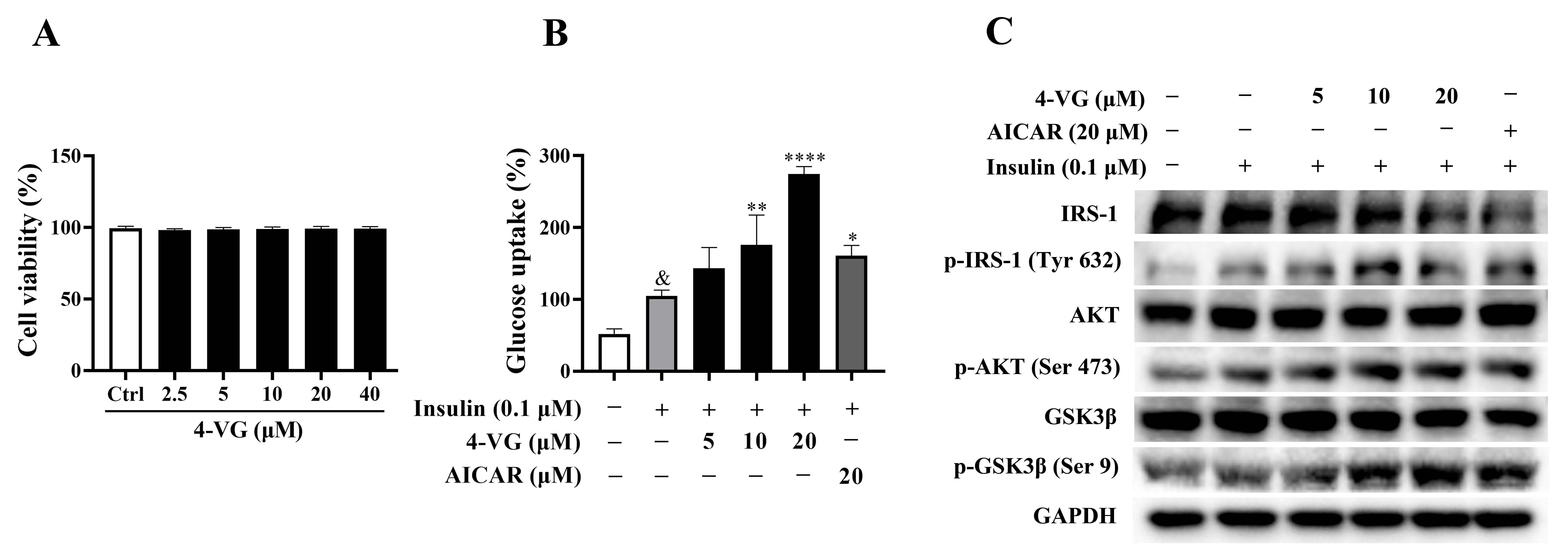 3.3. 4-VG Enhanced Glucose Uptake in C2C12 Myotubes via Activating IRS-1/Akt/GSK-3β Signaling Pathway