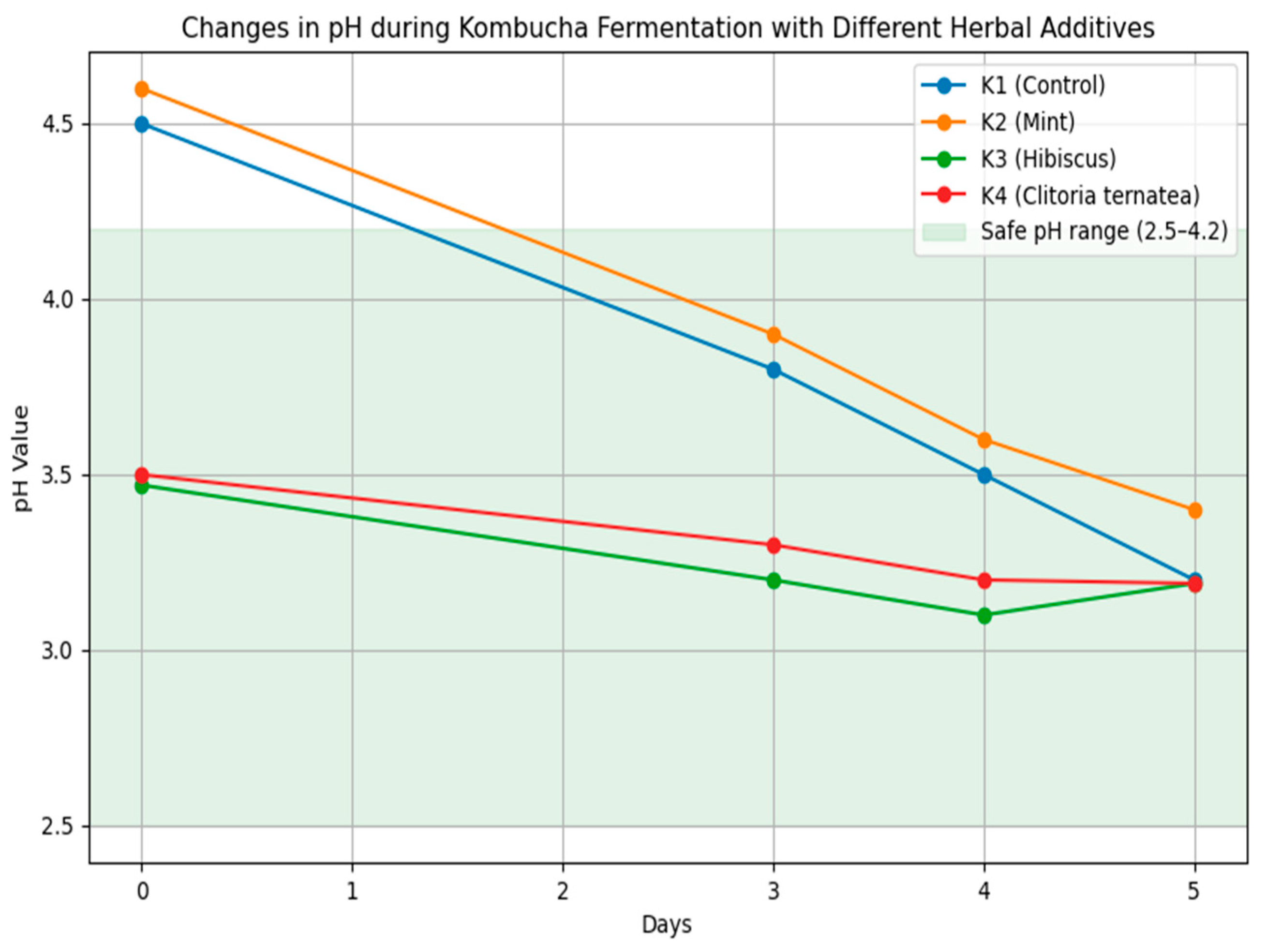 - Costa, L.; Almeida, R.; Silva, M. pH Dynamics in Green Tea Kombucha Fermentation. J. Food Ferment. 2022, 8, 201–210. [Google Scholar]