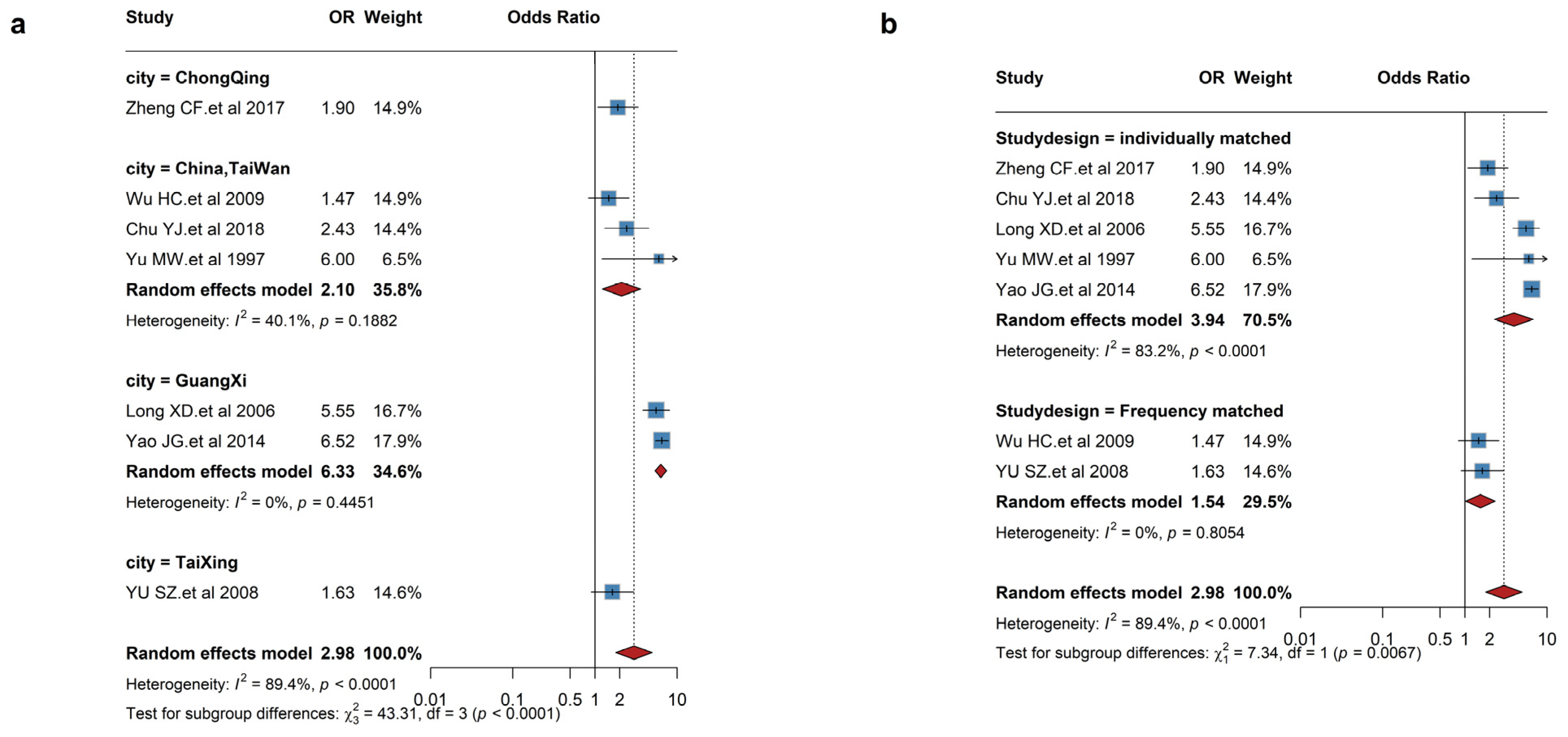 Long XD et al (2006) [49] | GuangXi | 2004–2005 | Individually matched | Age, sex, ethnicity, and hepatitis B virus infection. | AFB1 (μg/day) | >7 | 58 | 127 | 1 | 6 | Adjusted for age, sex, ethnicity, HBV infection, anti-HCV, and AFB1 exposure levels. |