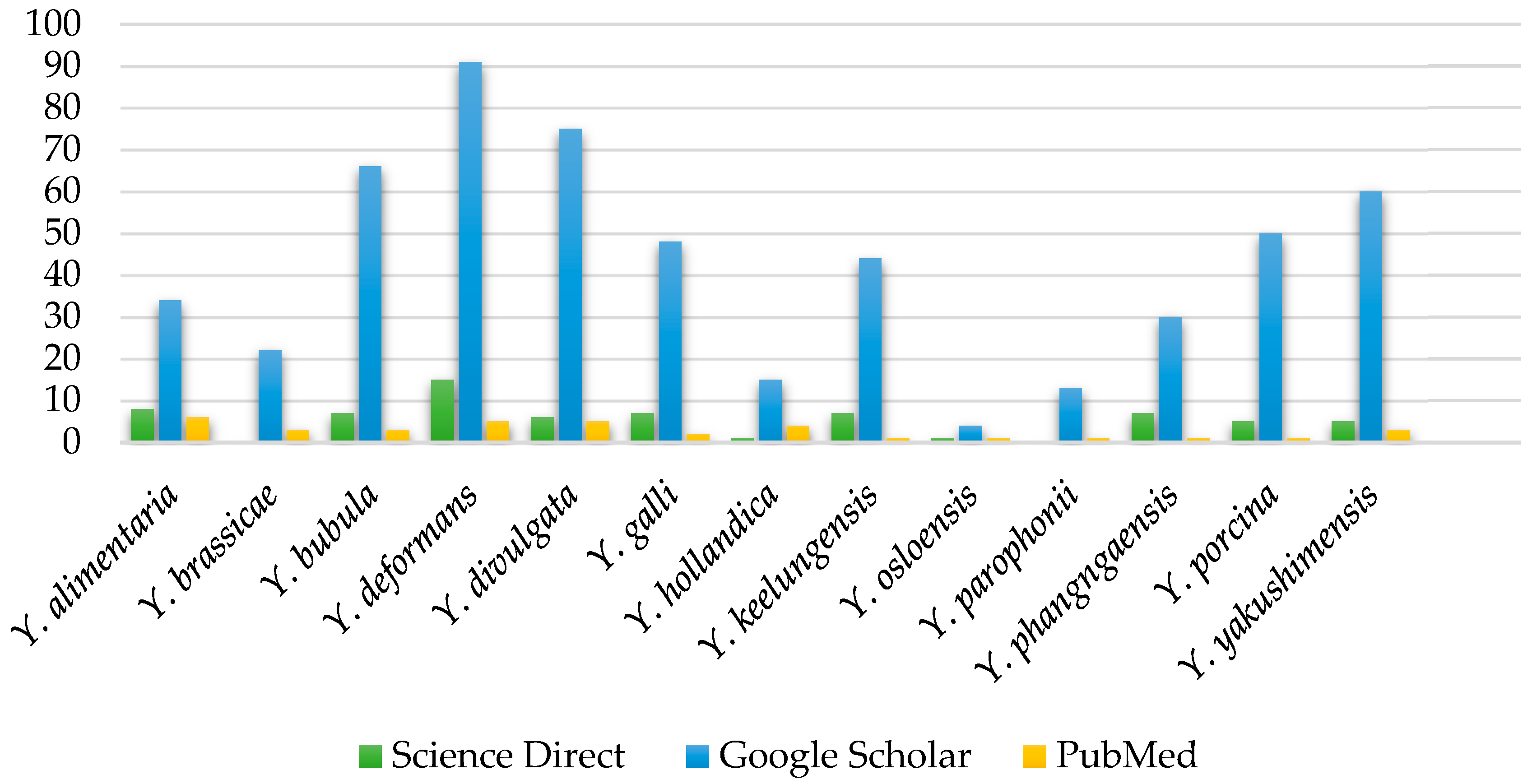Y. brassicae | up to 30 °C, fails at 35 °C | Sensitive (10% NaCl) | Urease and diazonium blue B reactions are negative, no fermentation | Not reported | Close to Y. divulgata, difficult to distinguish without molecular analysis | [5,61] |