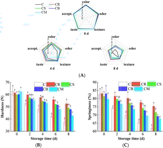 The effects of the treatments using Citrus peels on the sensory decline of beef. (A) Sensory scores; (B) Hardness; (C) Springiness. Different letters (a~e) indicate the significant difference (p < 0.05) between each treatment.