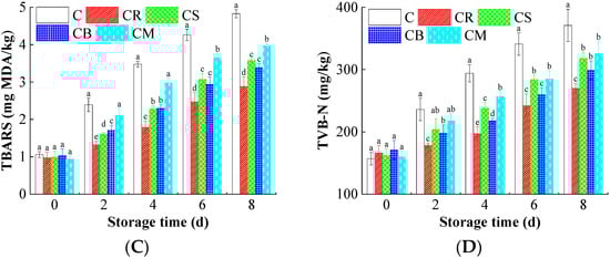 Thiobarbituric acid reactive substances (TBARS) of the preserved beef were expressed by malonaldehyde equivalents []. Briefly, minced beef was mixed with 2-thiobarbituric acid and n-butanol with a water bath at 95 °C for 30 min. TBARS was obtained by an ultraviolet spectrophotometer (UV-1800, Shimadzu Co., Kyoto, Japan) using the following formula: