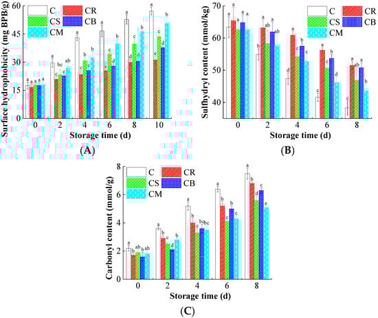 The effects of the treatments using Citrus peels on the variations in cellular microstructure of beef. (A) Surface hydrophobicity; (B) Sulfhydryl content; and (C) Carbonyl content. Different letters (a~e) indicate the significant difference (p < 0.05) between each treatment.