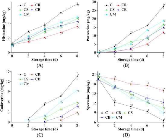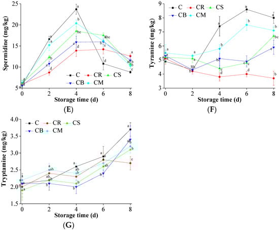 The effects of the treatments using Citrus peels on the accumulation of biogenic amines in the preserved beef. (A) Histamine; (B) Putrescine; (C) Cadaverine; (D) Spermine; (E) Spermidine; (F) Tyramine; and (G) Tryptamine. Means in same column with different letters are significantly different (p < 0.05).