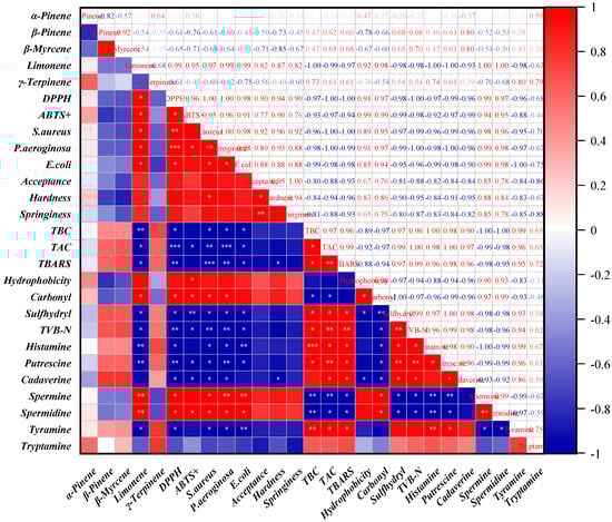 Pearson correlation coefficients among various parameters during the storage of Citrus peel beef. The symbol *, **, and *** indicate the significant level of p ≤ 0.05, p ≤ 0.01, and p ≤ 0.001, respectively.