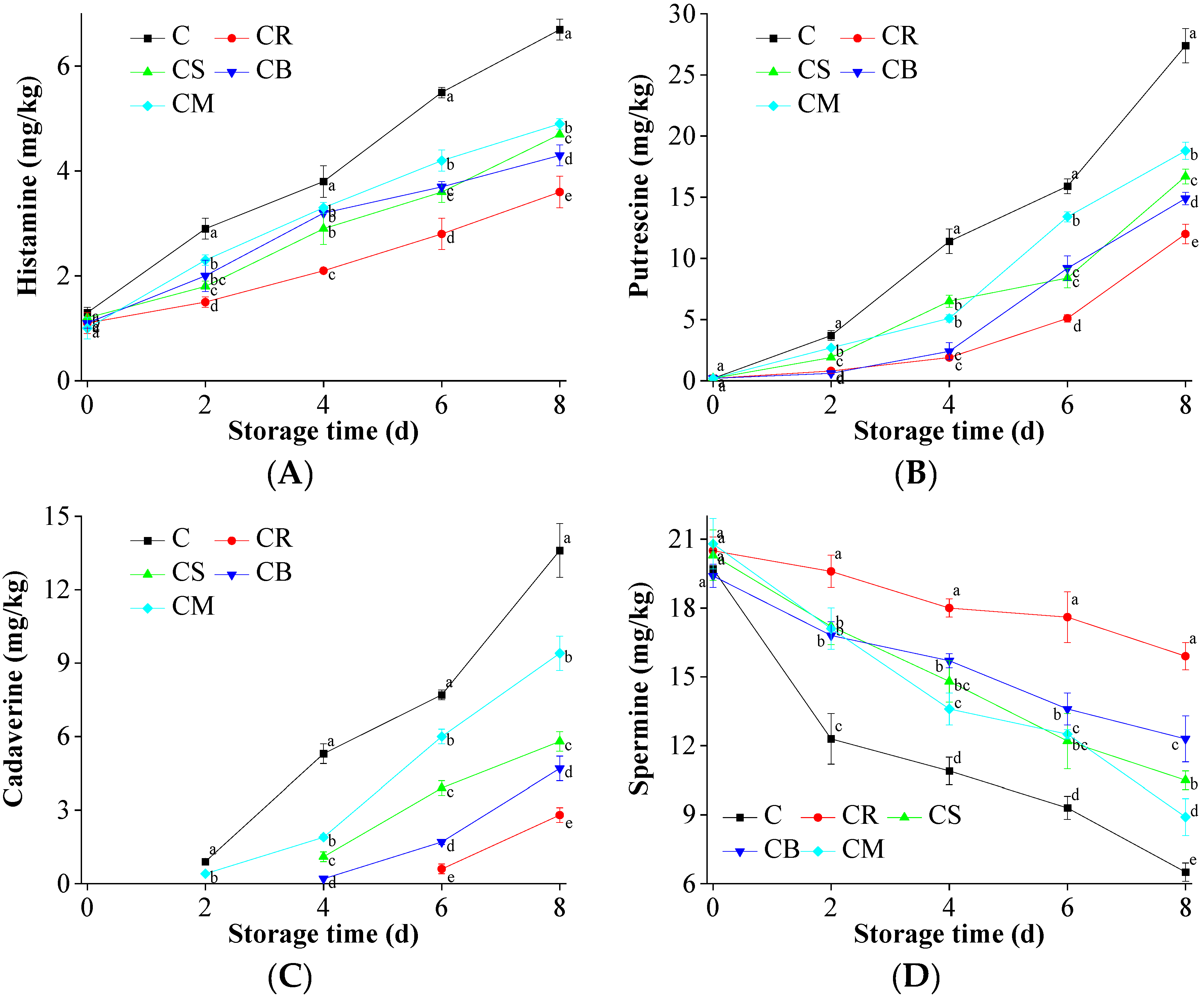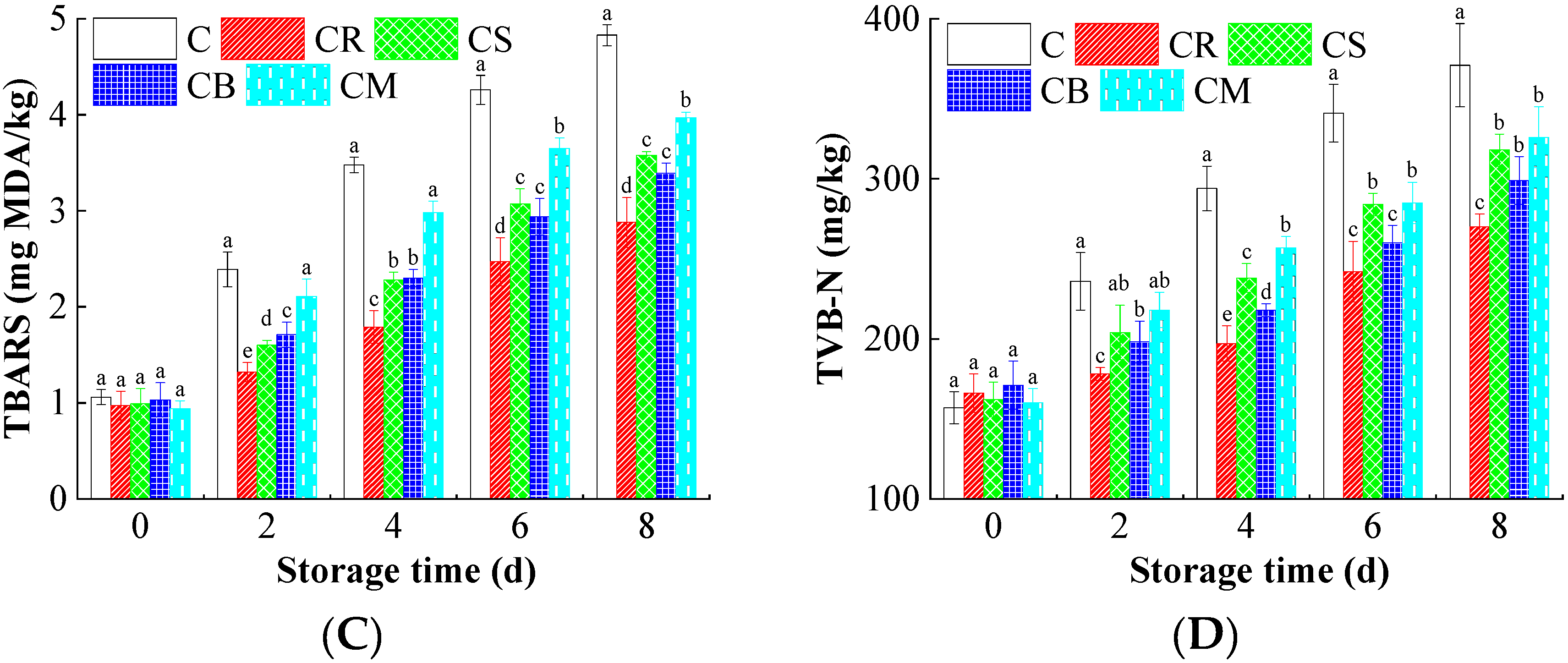 - Hui, X.D.; Wan, Y.; Dong, H.; Peng, J.; Wu, W.L.; Yang, X.F.; He, Q. A promising insight into the inhibition of lipid oxidation, protein degradation and biogenic amine accumulation in postmortem fish: Functional glazing layers of modified bio-polymer. LWT 2023, 177, 114575. [Google Scholar] [CrossRef]