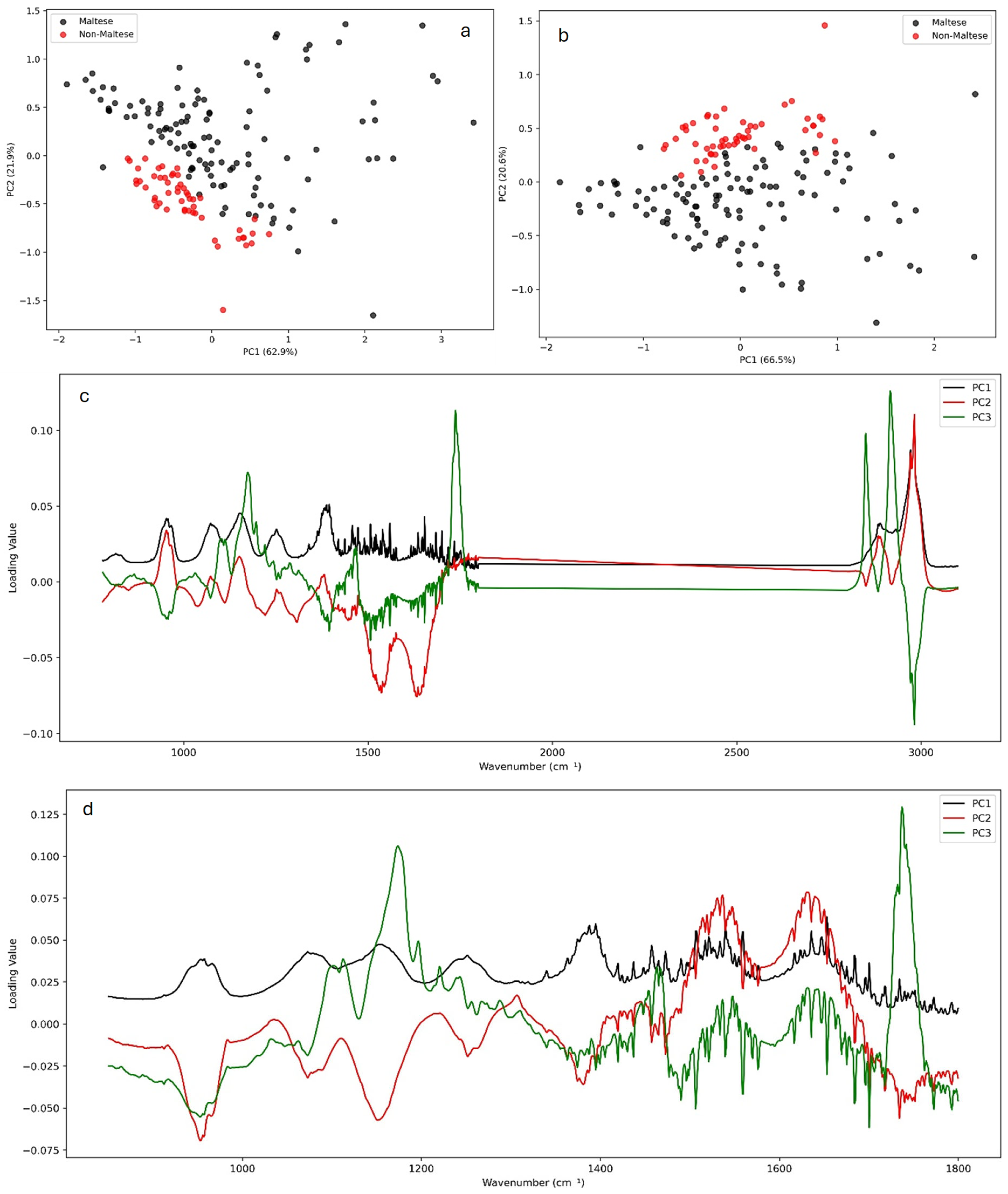 The ATR-FTIR spectra revealed clear biochemical differences between Maltese and non-Maltese pork across protein-, lipid-, ester-, and carbohydrate-associated regions previously identified by other authors [