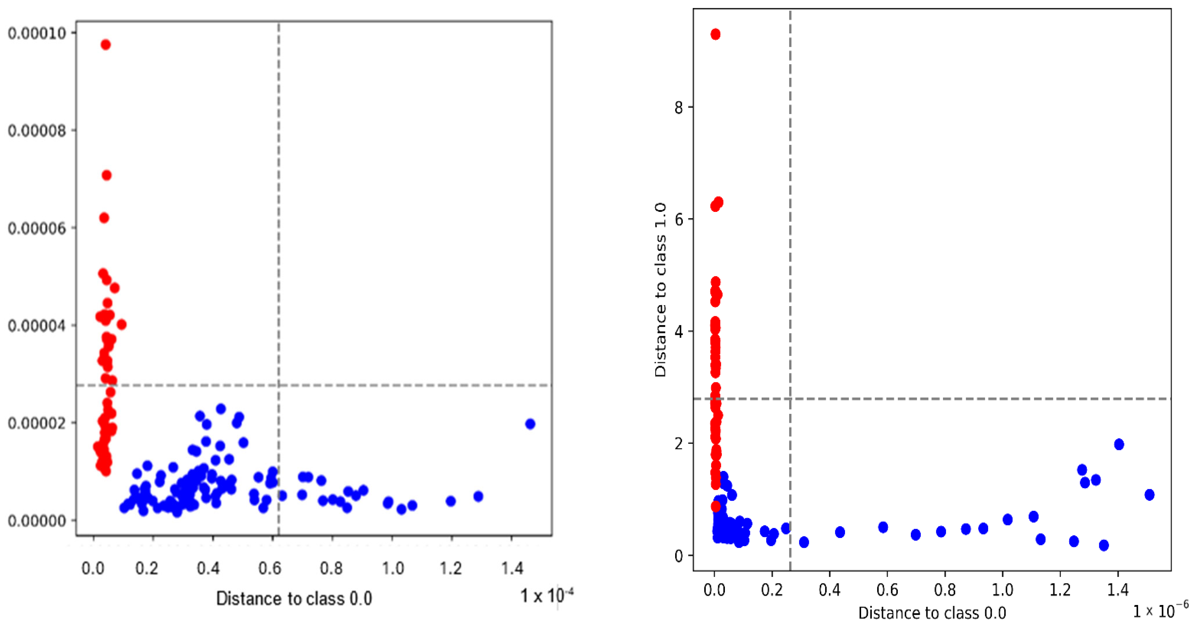 k,i is the residual distance of sample i to class model k. For two-class comparisons, Coomans plots were constructed to visualize sample positions relative to both class models, providing a graphical overview of membership, ambiguous cases, and potential outliers. The SIMCA performance was assessed using different parameters, namely accuracy, defined as the proportion of correctly classified samples relative to the total number of samples: