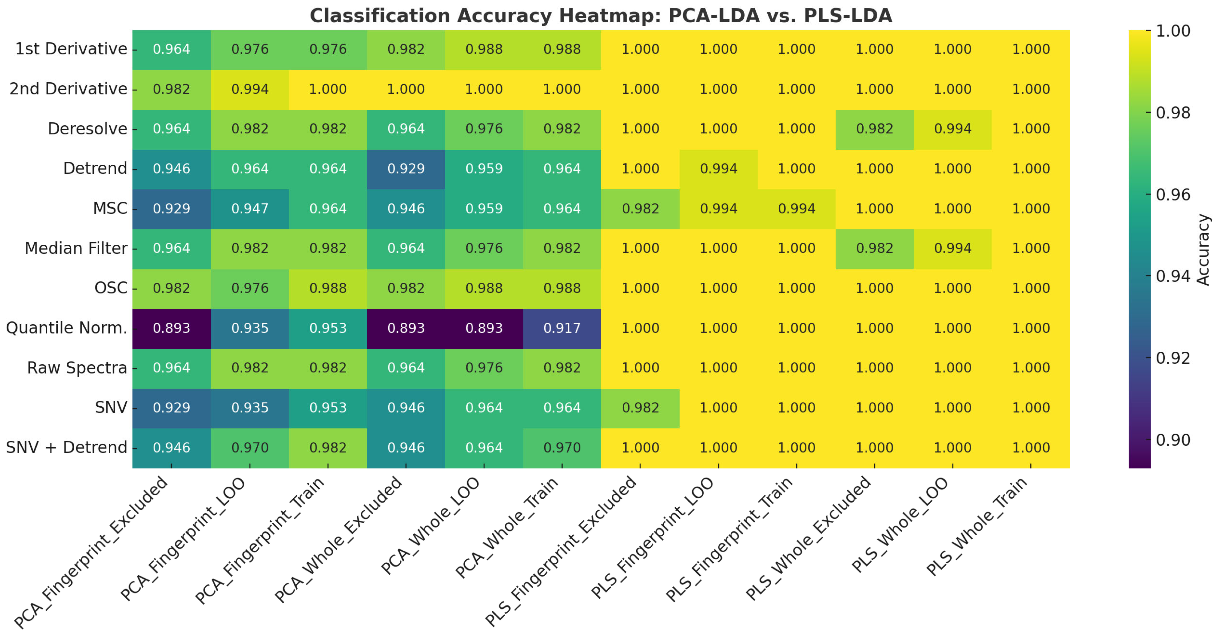 In addition to leave-one-out (LOO) cross-validation, a Venetian blinds approach was employed for excluded-sample validation, as this strategy leaves out systematic blocks of spectra rather than single observations, thereby providing a more realistic estimate of prediction error and reducing the tendency of LOO to overestimate error in small samples. In this study, every third sample in the dataset was systematically excluded prior to model training and used solely for model evaluation. This form of stratified sampling ensures that each excluded observation is not adjacent or strongly correlated to those used for training, thereby mimicking an external validation set and avoiding overly optimistic estimates caused by temporal or batch autocorrelation. Specifically, 33% of the samples (every 3rd entry) were withheld and not used during model training. The remaining 67% formed the training set and were used to build the PCA-LDA and PLS-LDA models. Predictions were then generated for the excluded subset and classification accuracy was computed based on the proportion of correctly predicted labels: