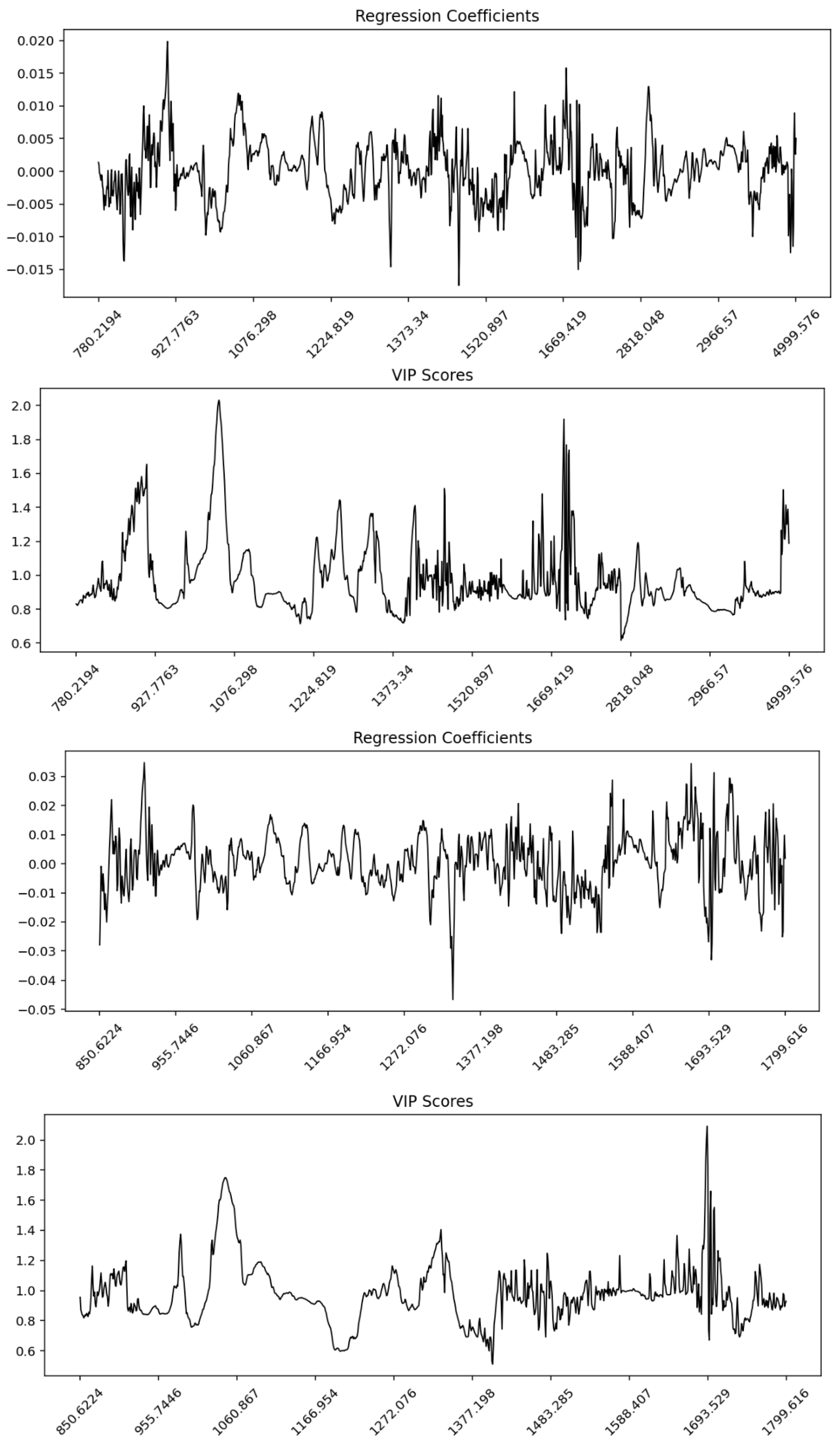 Regression coefficients for each wavenumber were extracted from the PLSR model using the optimal number of LVs. Additionally, Variable Importance in Projection (VIP) scores were calculated to assess the relative contribution of each spectral variable to the model. VIP scores were computed following the approach of Wold et al. (2001) [