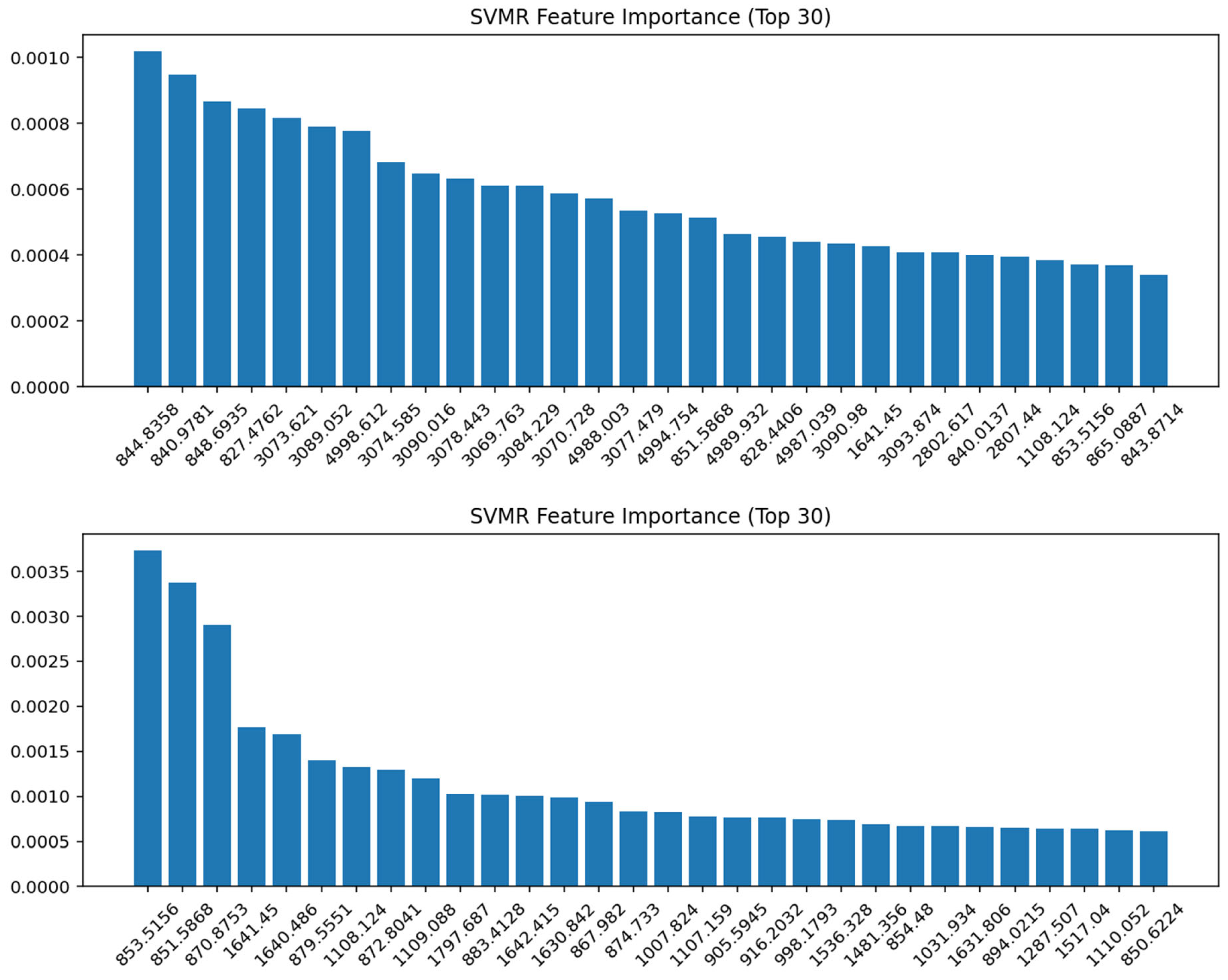 Support Vector Machine Regression (SVMR) was implemented using a radial basis function (RBF) kernel via the scikit-learn library. Similar to PLSR, the response was modeled as a continuous variable rather than a discrete categorical outcome. Model hyperparameters were optimized through an exhaustive grid search combined with five-fold cross-validation, using the coefficient of determination (R2) as the selection criterion. The hyperparameter space explored included C (regularization parameter): {0.1, 1, 10, 100}; ε (insensitive loss): {0.01, 0.1, 0.5, 1.0}; and γ (kernel coefficient): {‘scale’, ‘auto’}. Model performance was evaluated using the RMSE and coefficient of determination (R2) for the training set using leave-one-out cross-validation (LOOCV) and excluded rows validation. To interpret the relative contribution of spectral variables to the SVMR model, permutation importance analysis was performed using 10 randomized repetitions. The top 30 most informative wavenumbers were ranked based on their mean importance scores and visualized for biochemical interpretation.