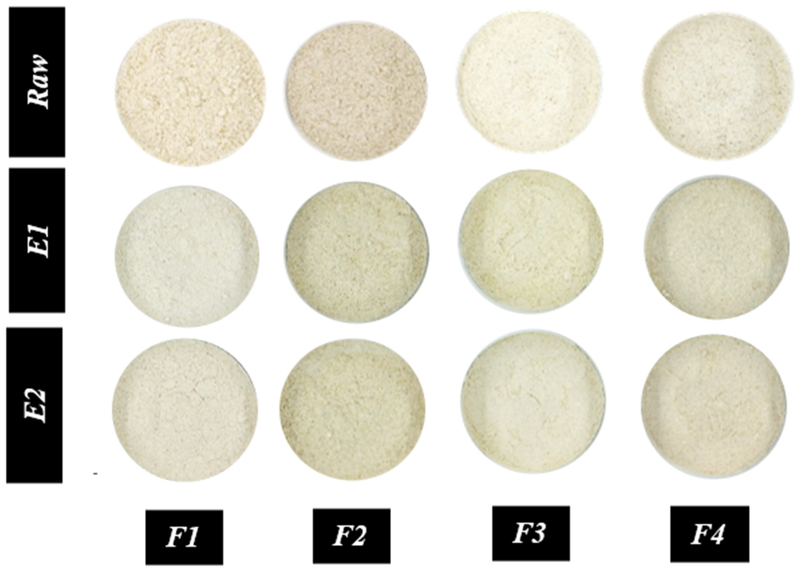 F2 (15/60/15/10) | Raw | b 1.62 ± 0.06 | c 8.37 ± 0.03 | b 1.31 ± 0.02 | c b10.50 ± 1.91 | a 81.05 ± 0.24 |