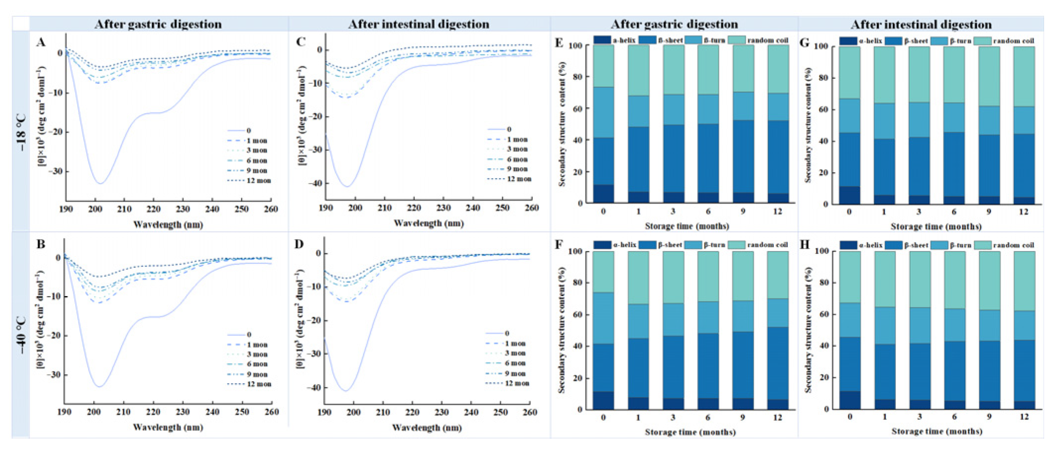- Pan, N.; Bai, X.; Kong, B.; Liu, Q.; Chen, Q.; Sun, F.; Liu, H.; Xia, X. The Dynamic Change in the Degradation and in Vitro Digestive Properties of Porcine Myofibrillar Protein during Freezing Storage. Int. J. Biol. Macromol. 2023, 234, 123682. [Google Scholar] [CrossRef] [PubMed]