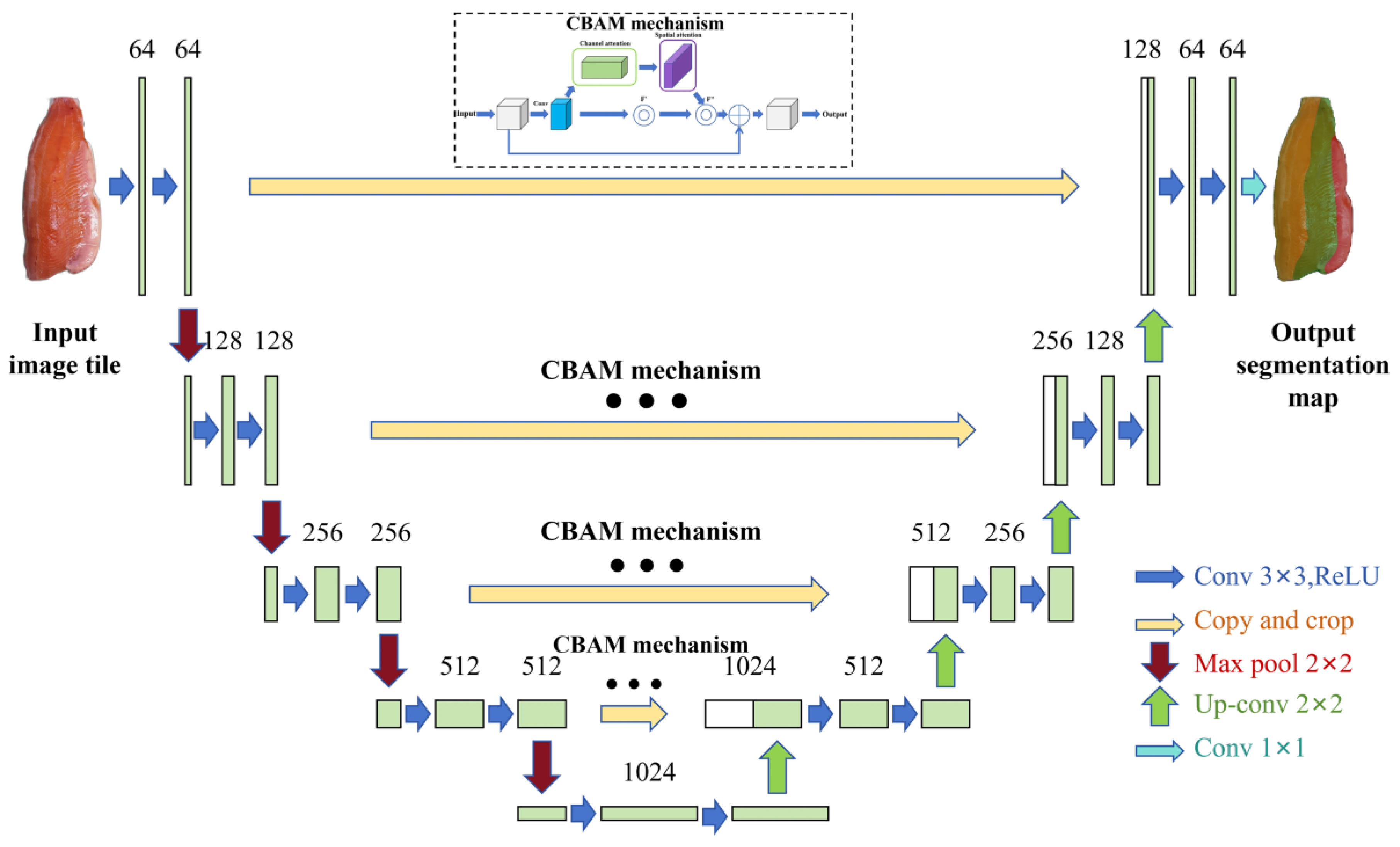 - Qian, C.; Zhang, J.P.; Tu, X.Y.; Liu, H.; Qiao, G.; Liu, S.J. A CBAM-UNet-based egg identification and counting method for turbot. South. Fish. Sci. 2024, 20, 132–144. [Google Scholar]