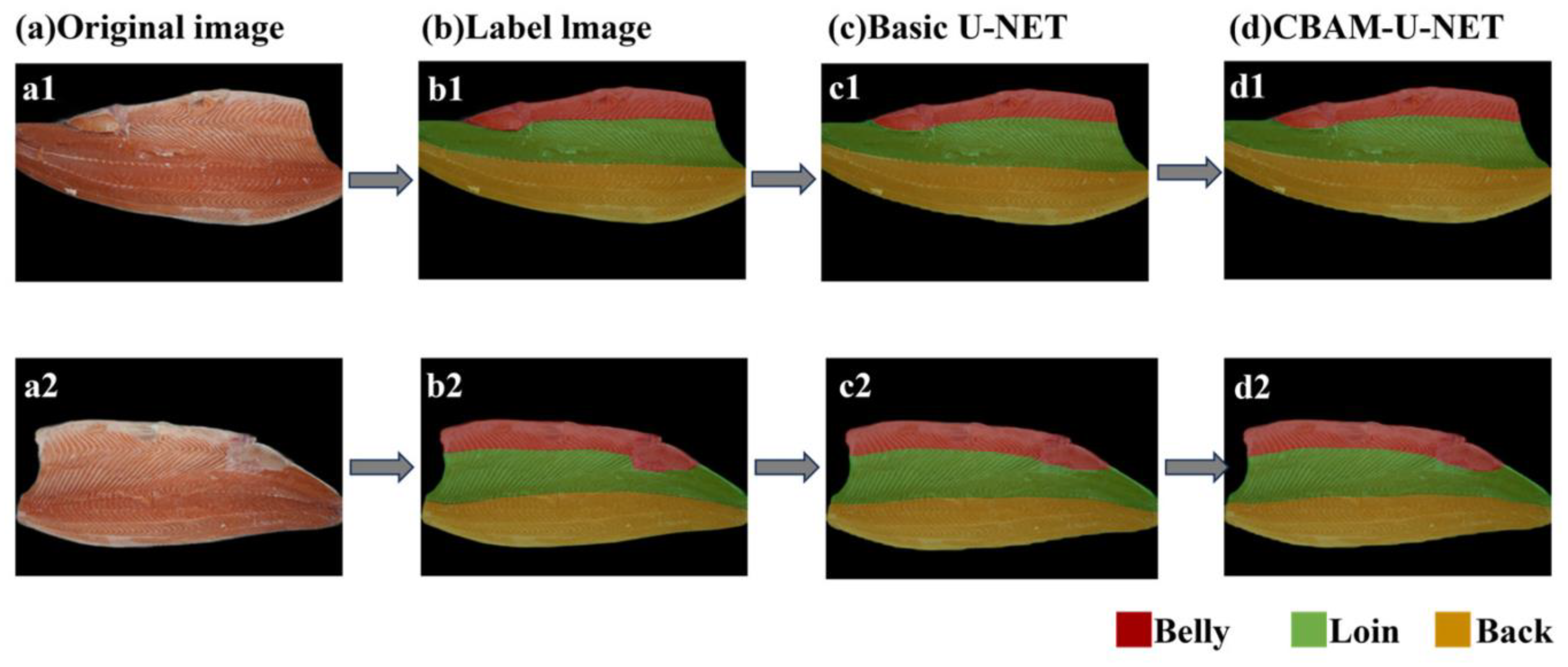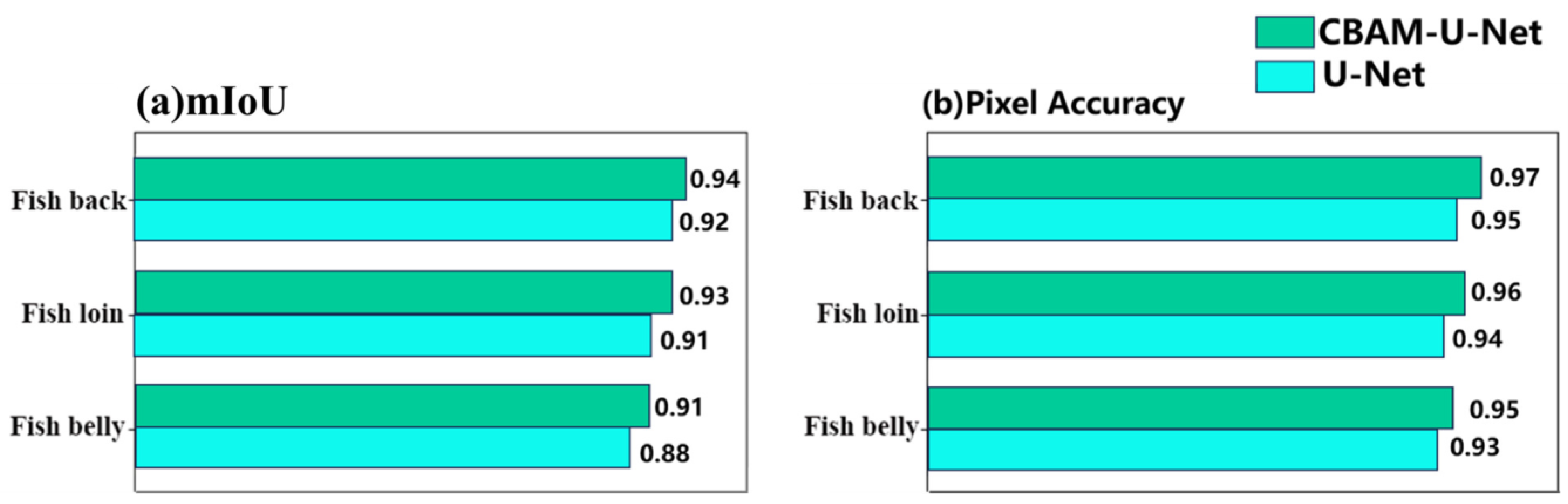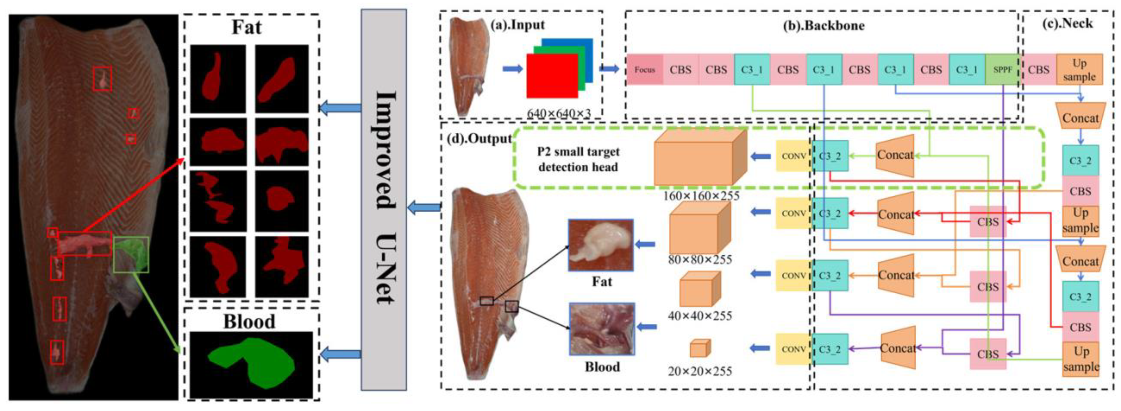 Zhang, C.; Zhao, Y.; Yang, W.; Gao, L.; Zhang, W.; Liu, Y.; Zhang, X.; Wang, H. Computer Vision-Based Deep Learning Modeling for Salmon Part Segmentation and Defect Identification. Foods 2025, 14, 3529. https://doi.org/10.3390/foods14203529